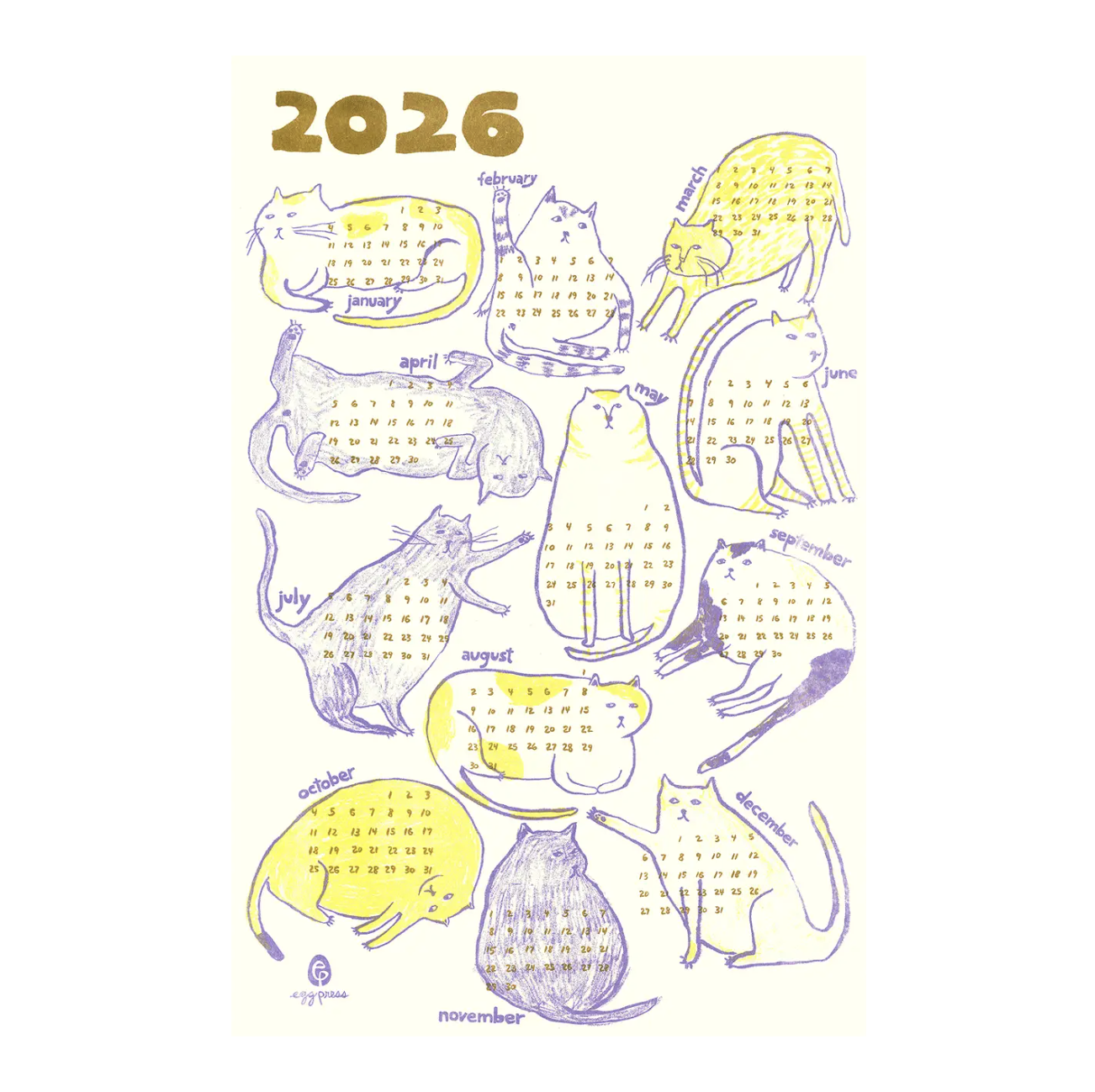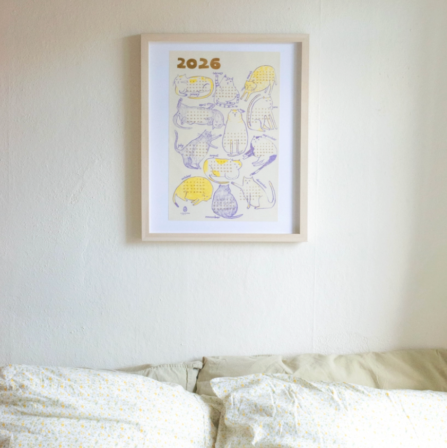 This 2026 reference calendar is printed on toothy, textured cover stock with vibrant Risograph inks. Frame it, hang it, or tack it up in your office or kitchen for a bit of cheeky & elevated decor.