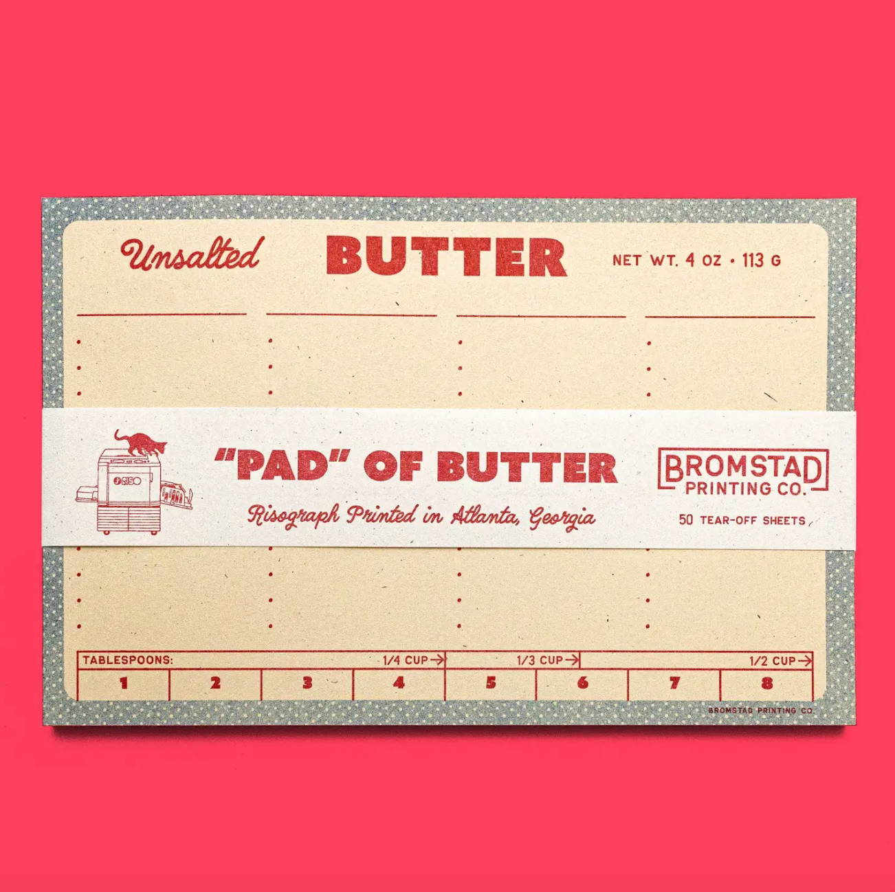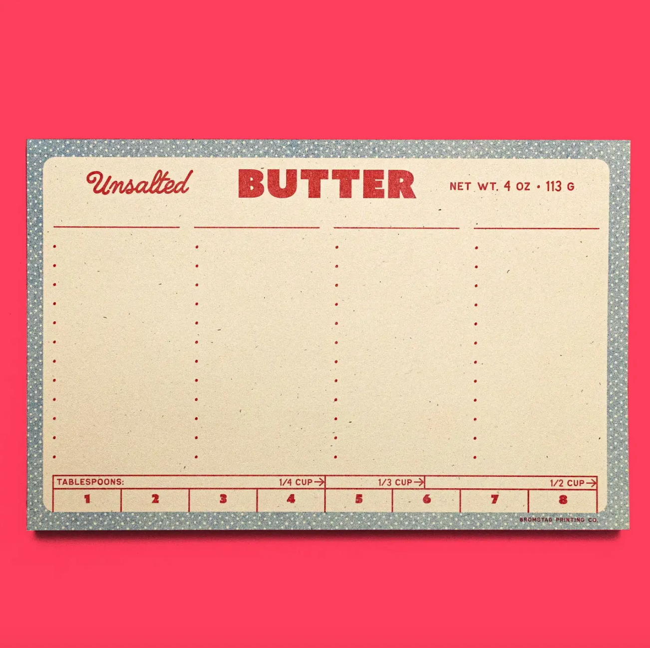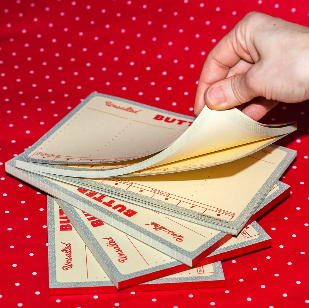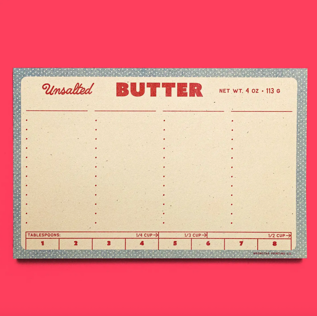 Oh wait no it is this butter notepad! Four columns where you can fill in your own custom headers and above bulleted spaces to list items to make your next trip to the grocery store smooth as butter. Risograph printed in bright red and federal blue with red glue on the left edge.