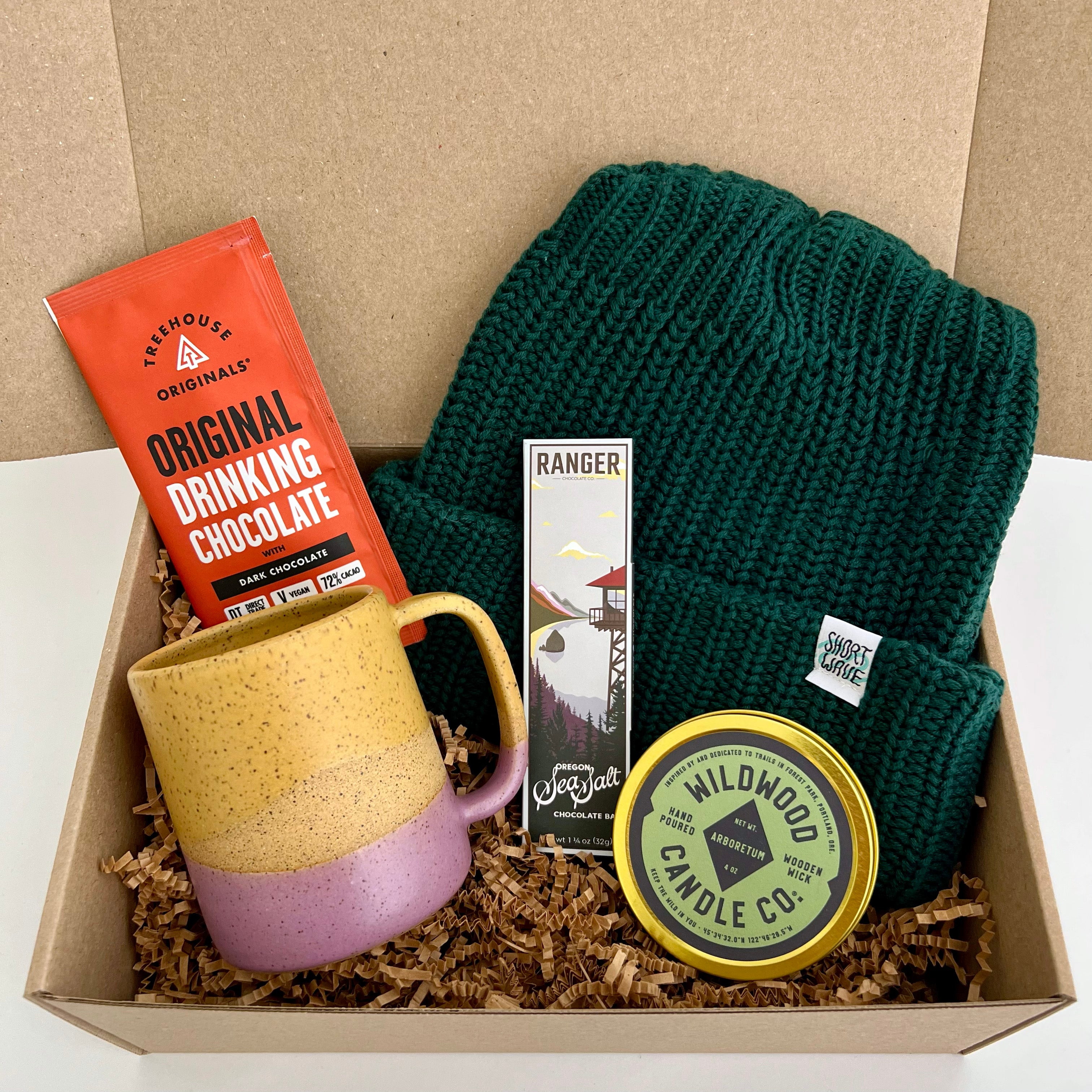 Everything in the Cozy Cocoa Gift Box, plus a crackling wood wick candle and a cozy 100% cotton beanie. Maximum coziness! As a bonus, everything included in this gift box is made in Oregon.
