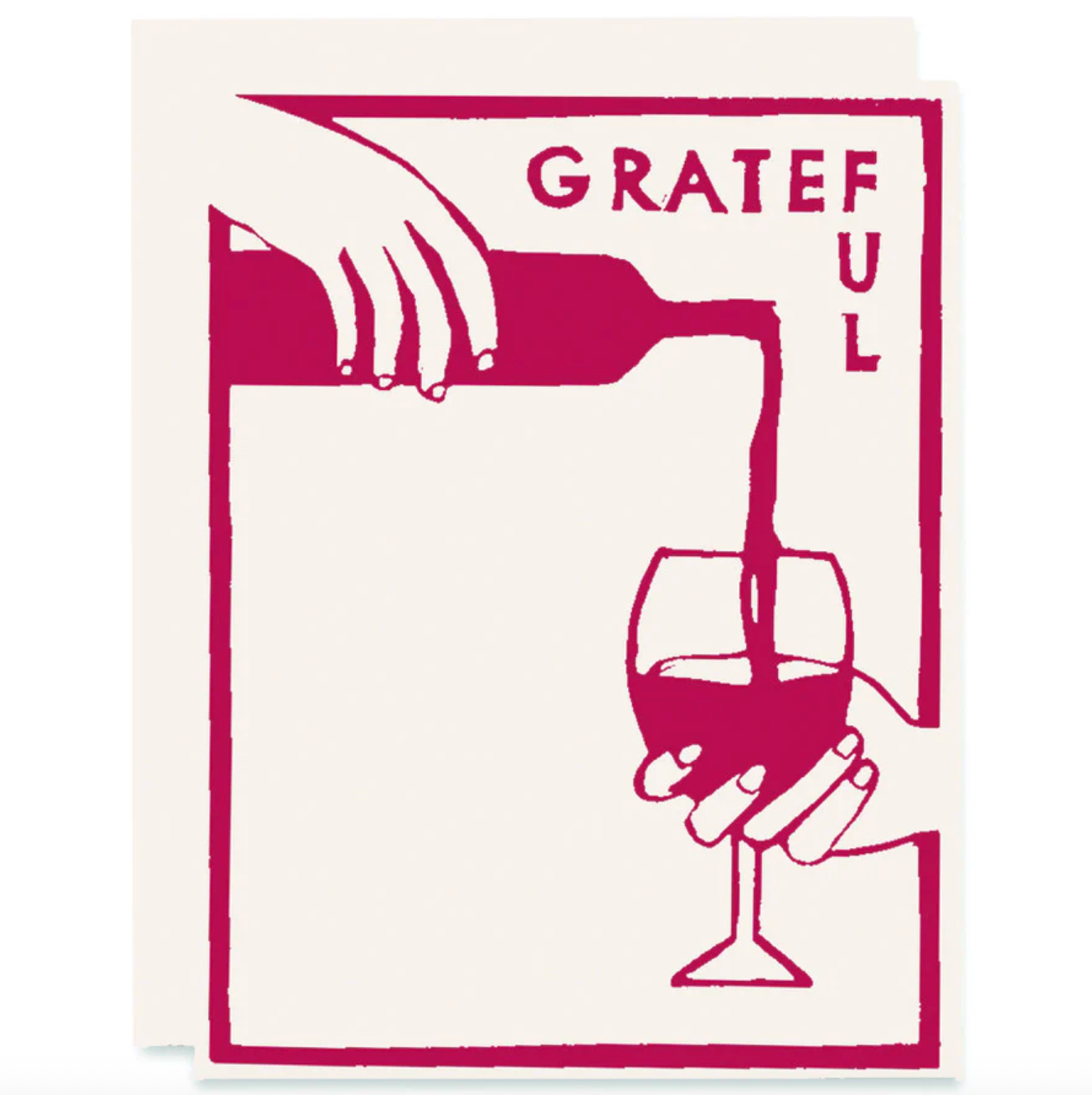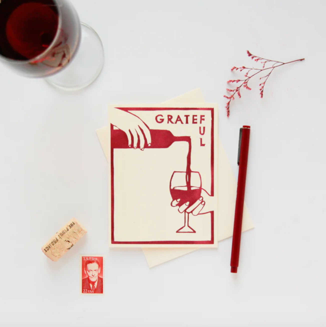 Express your gratitude with this card featuring artwork of a half-full glass of wine. Perfect for Thanksgiving or any time you feel grateful for someone. Letterpress printed from hand-carved woodblocks.