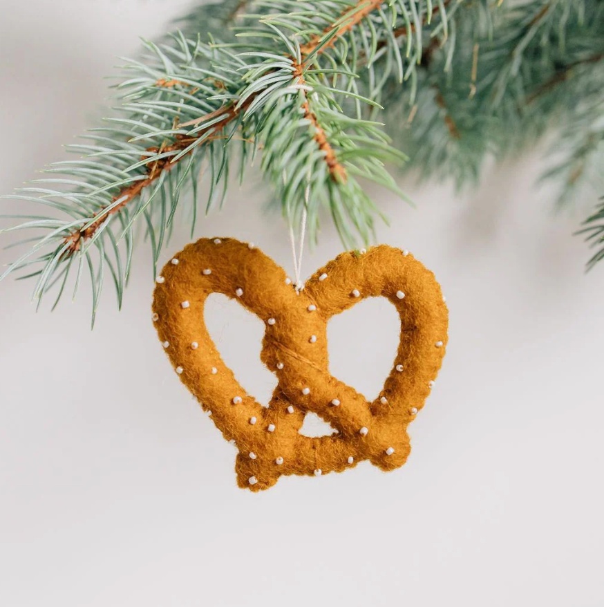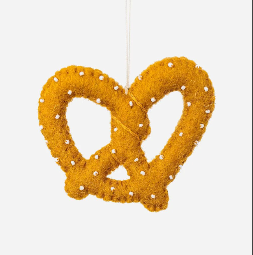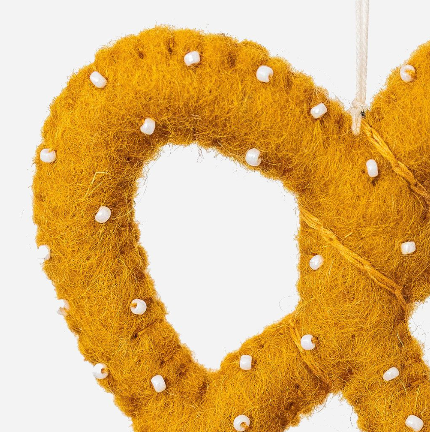 This 100% wool felted pretzel is encrusted with tiny pearlescent beads that look just like the salt on a big soft pretzel. This ornament will make you hungry for your favorite snack every time you look at your Christmas tree, or wherever you choose to hang it.
