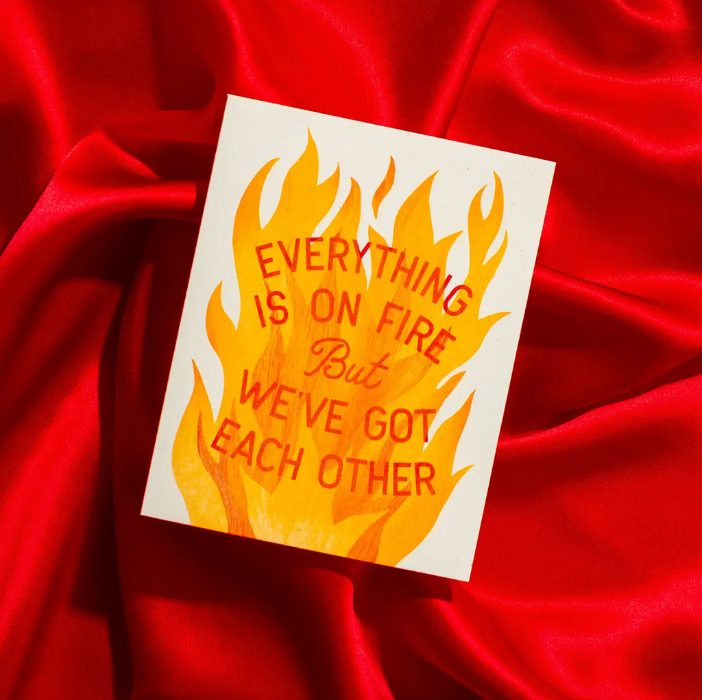 Sometimes (all the time lately?) it can feel like the world is on fire — sometimes literally. But whether it's a friend or a lover, we've got each other to get through it together. Risograph printed in bright red and sunflower yellow.