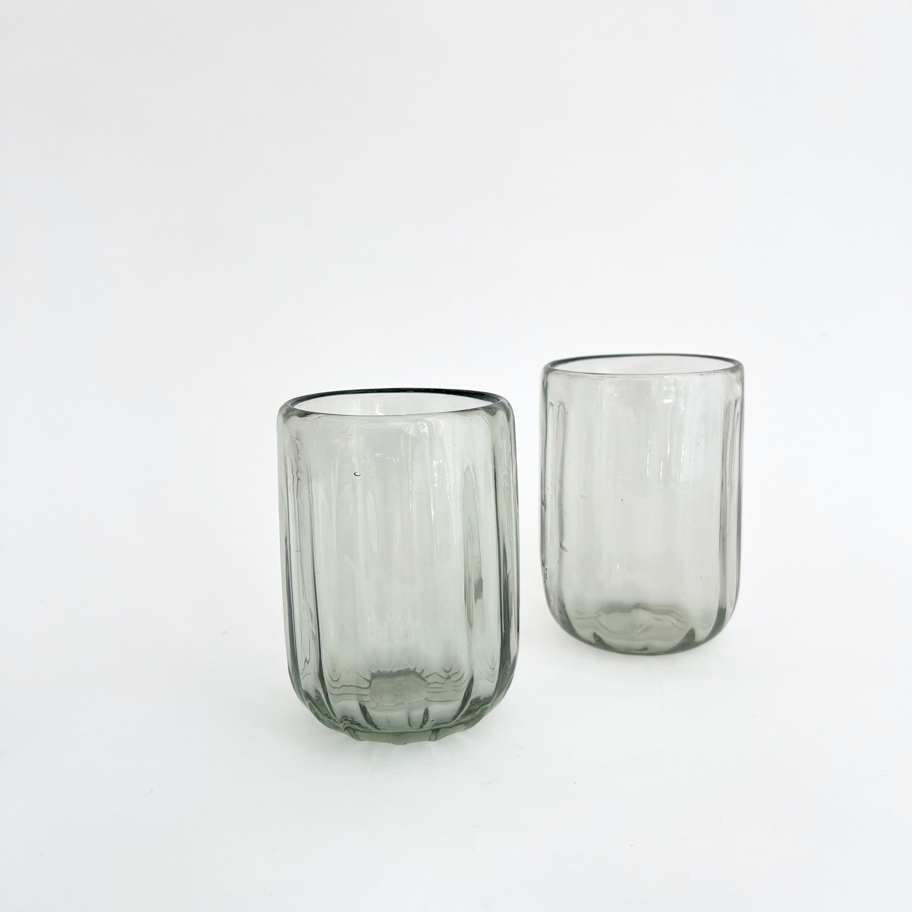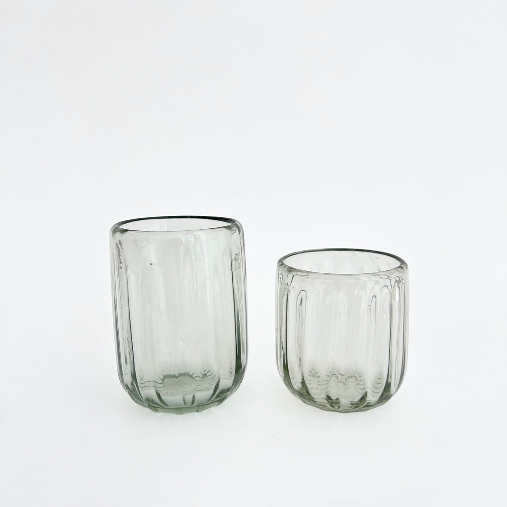 Gorgeous hand blown 100% recycled glass fluted tumbler with a very slight green tint. The ridges add visual interest and make it easier to hold. Each one is completely unique and their lack of perfect uniformity give them a warm, organic quality that you only find in handcrafted objects. Perfect for water, cocktails on ice, or juice.