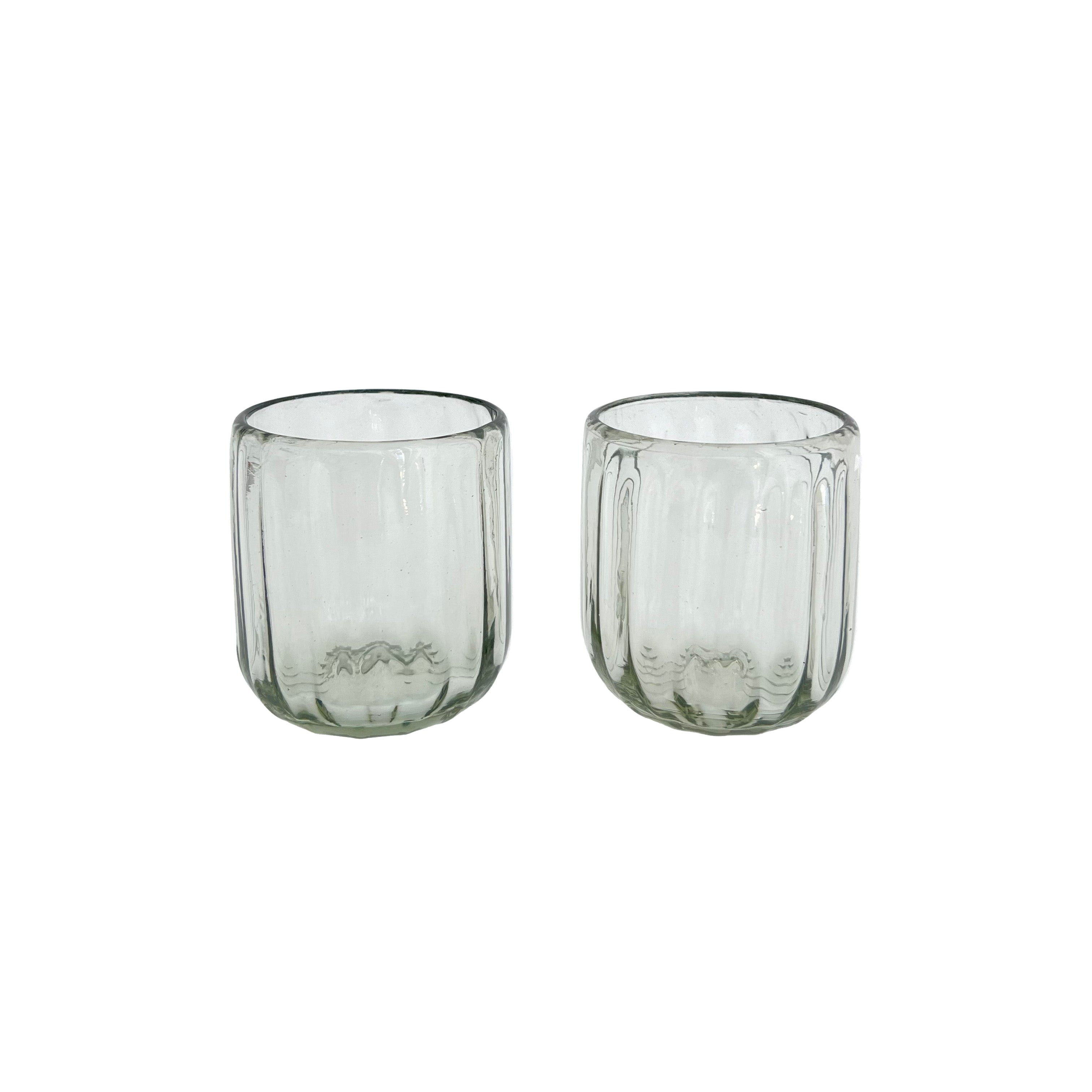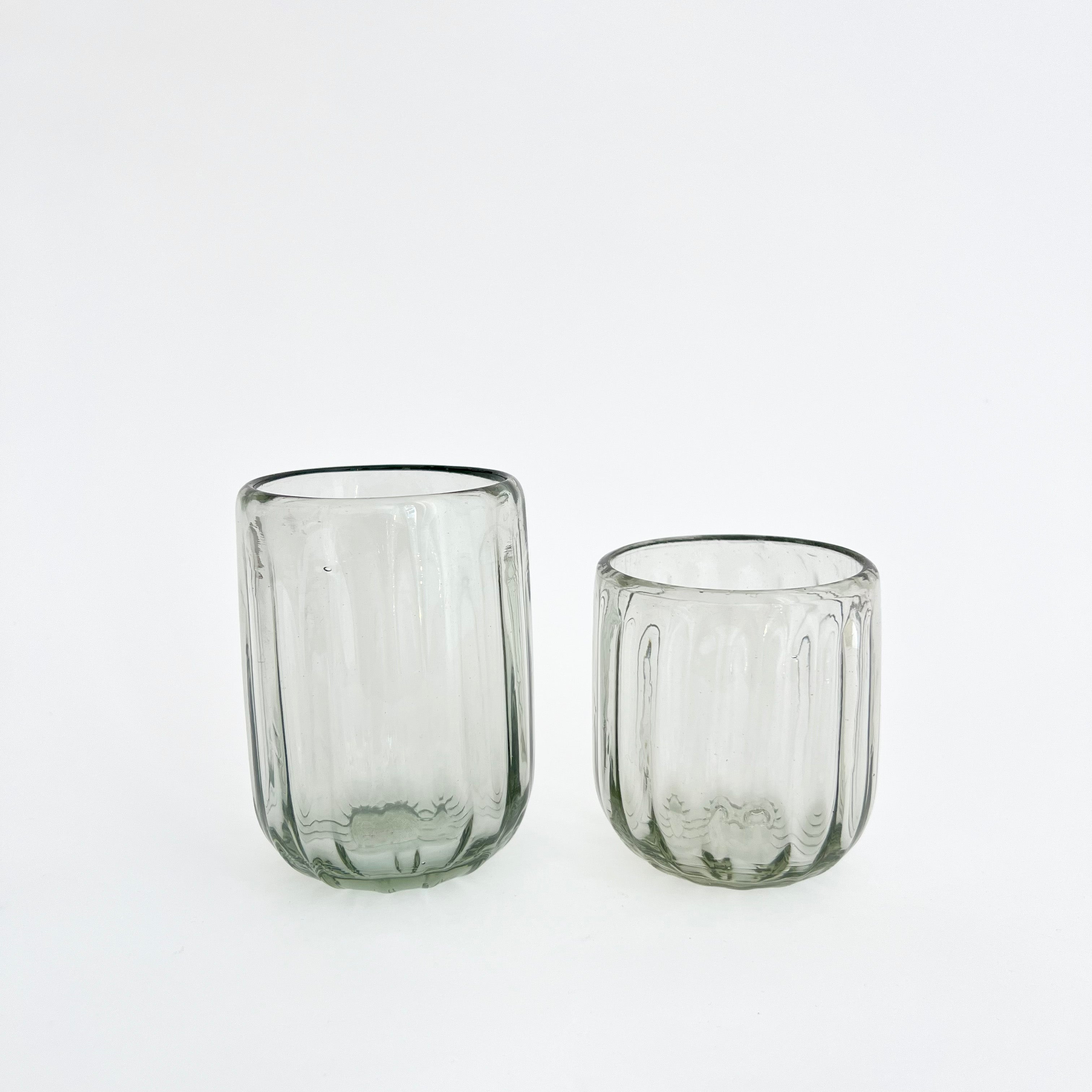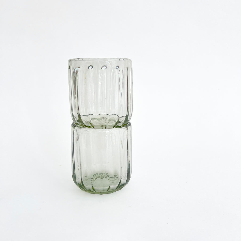 Gorgeous hand blown 100% recycled glass fluted tumbler with a very slight green tint. The ridges add visual interest and make it easier to hold. Each one is completely unique and their lack of perfect uniformity give them a warm, organic quality that you only find in handcrafted objects. This smaller size is perfect for cocktails, wine or juice.