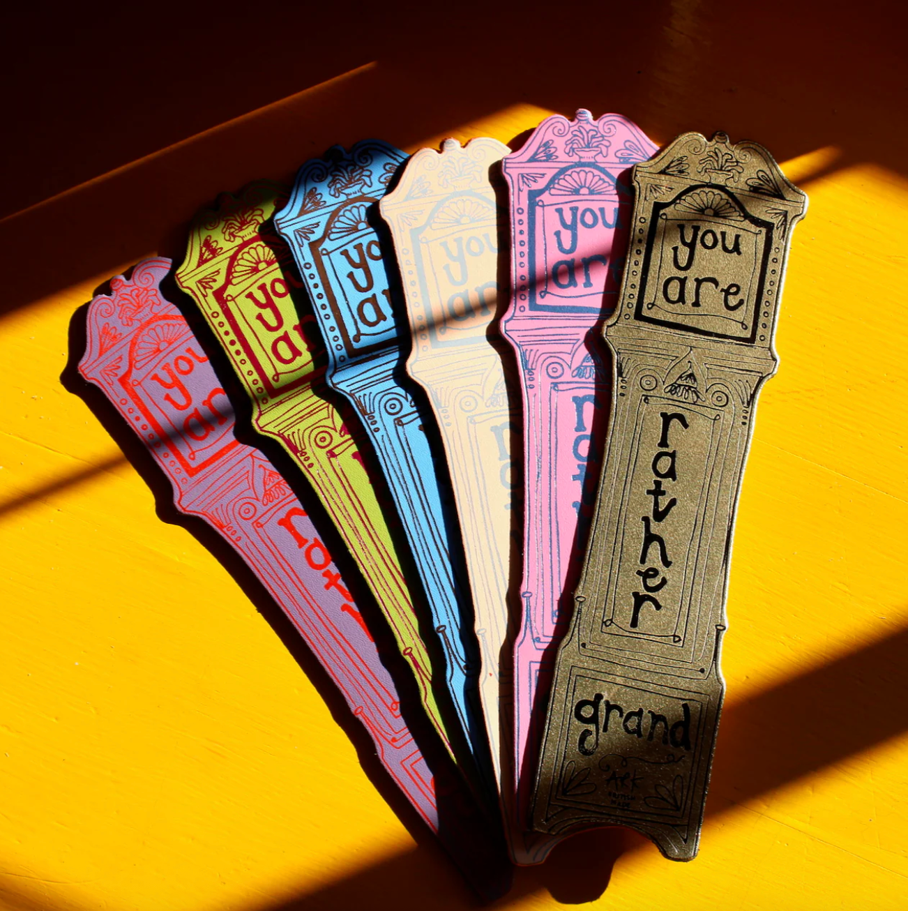 Waste no time in discovering Ark's newest bookmark design. Made with striking foil embossed details. Embossed with "You're rather grand" on the reverse.