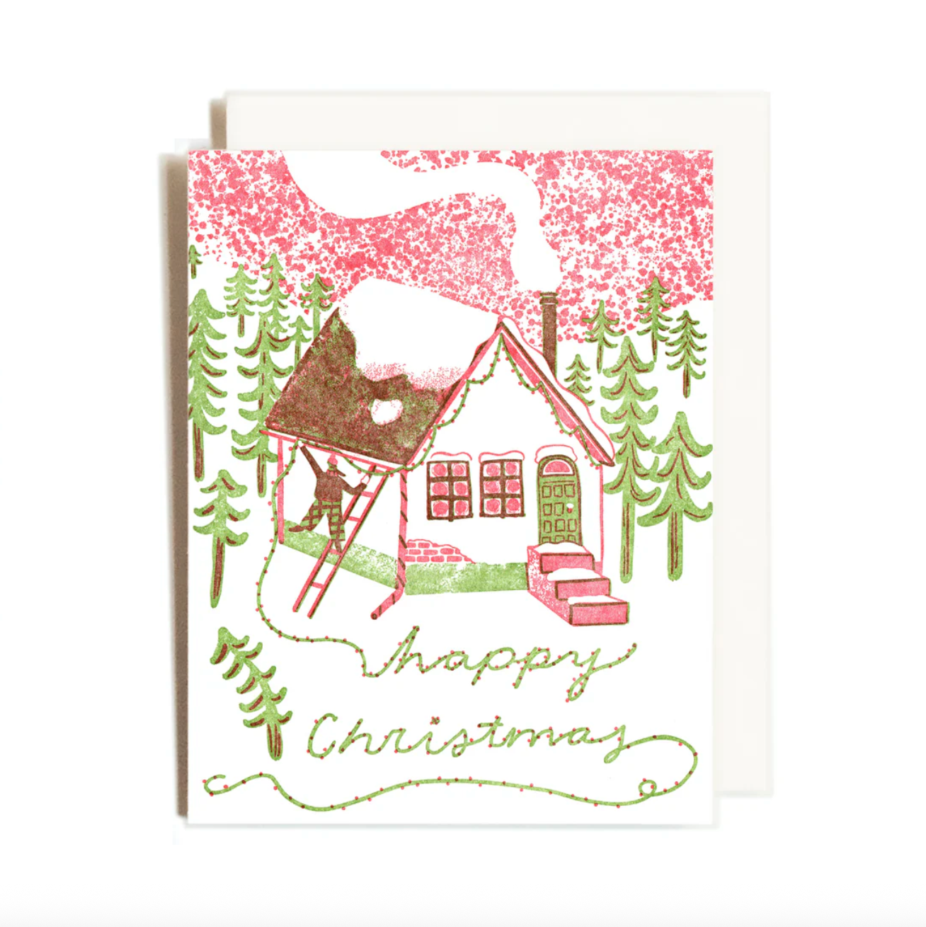 A sweet and cozy card featuring a person decorating a cabin in the snow for the holidays, printed in a retro pink and grass green color combination. Card says "Happy Christmas" and is blank inside. Designed and printed by Homework Letterpress Studio.