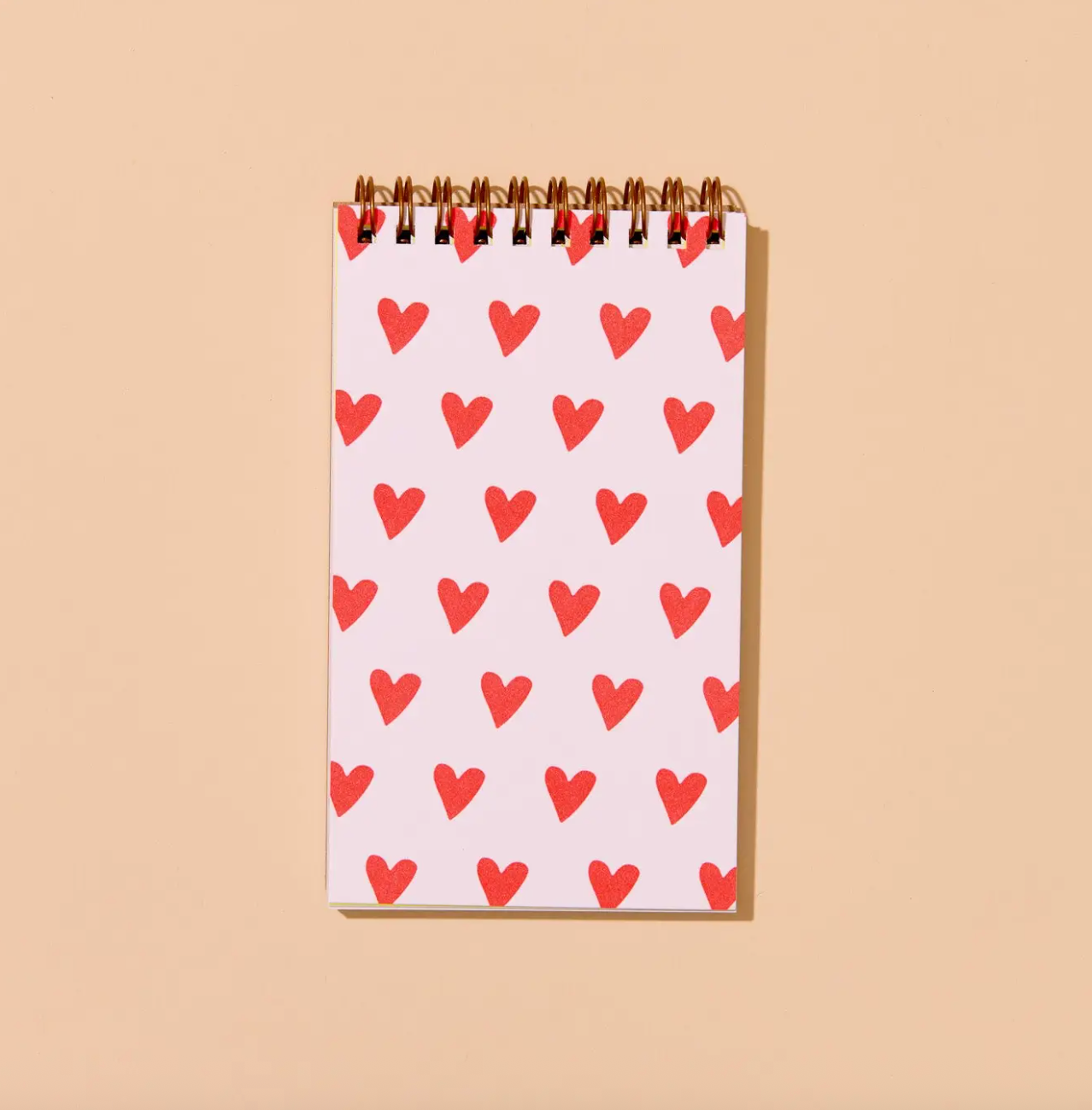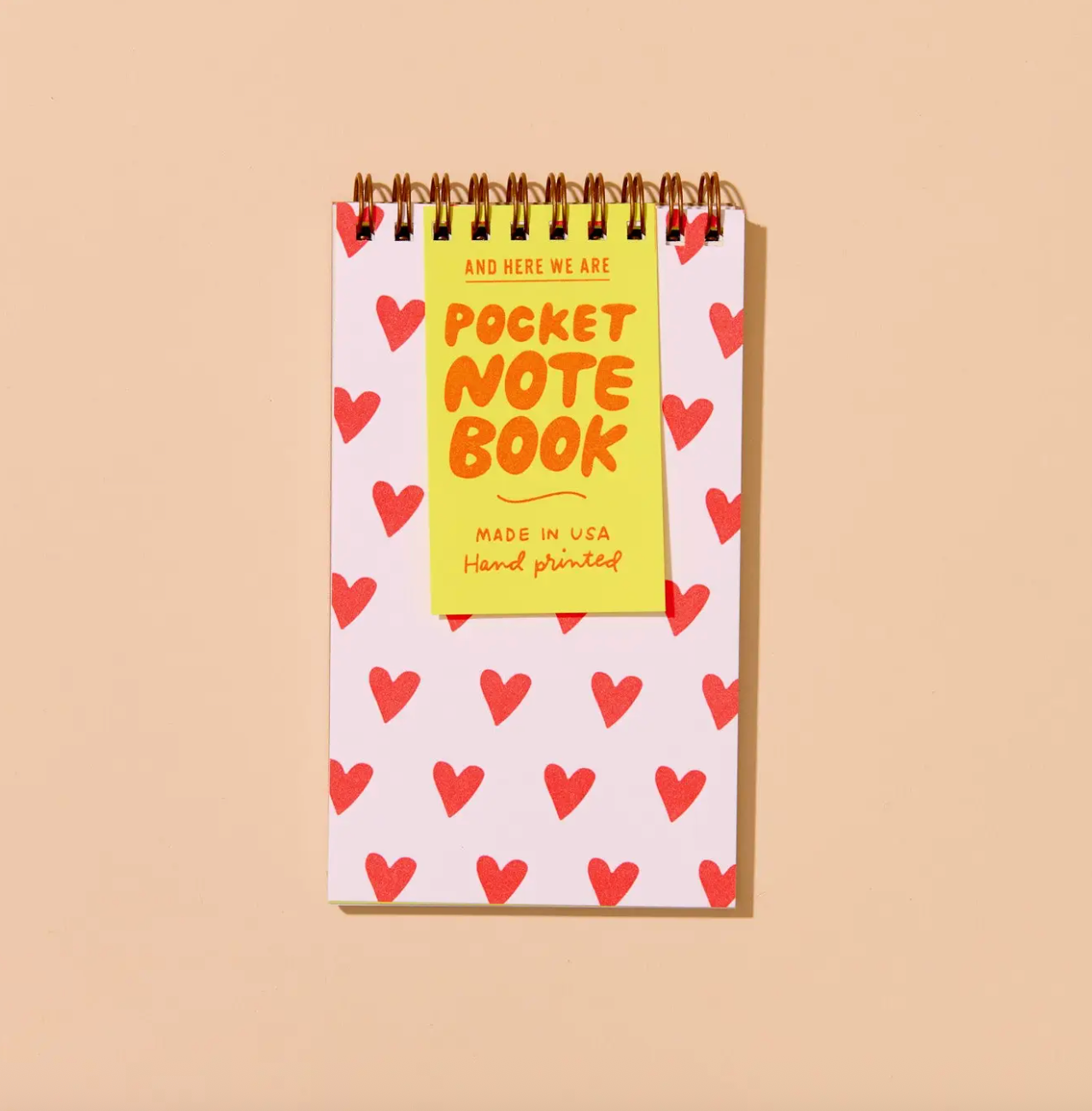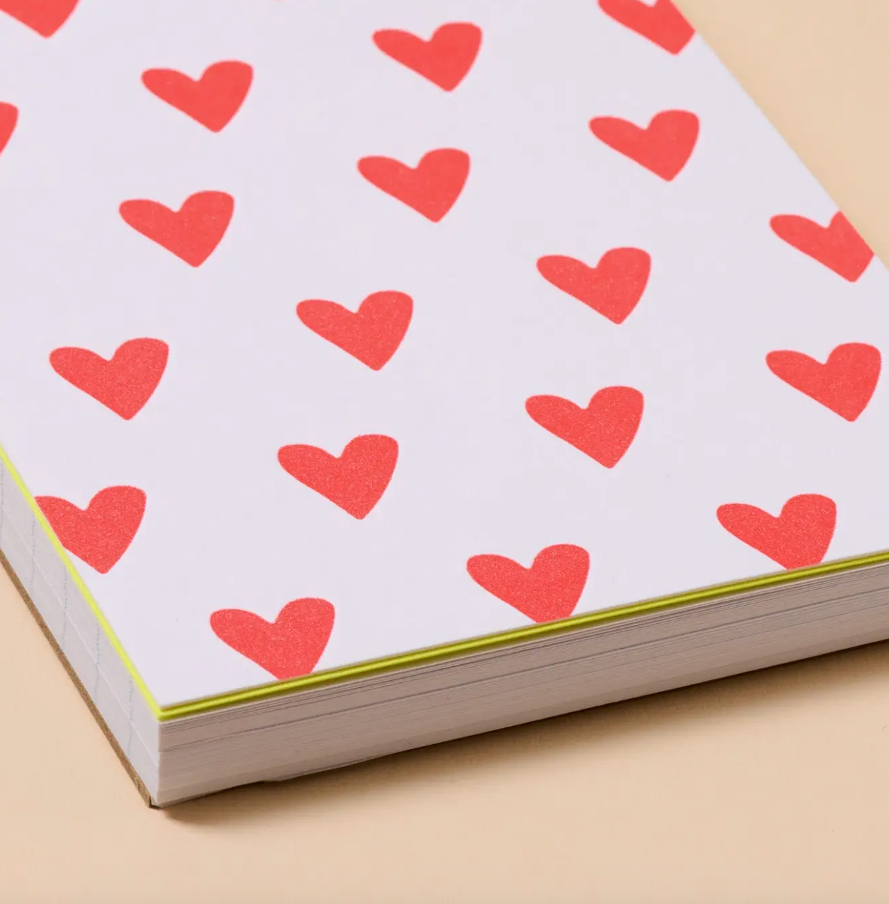 You're sure to fall in love with this pocket-size letterpress spiral notebook, hand printed with a pattern of neon red hearts. 60 lined pages.