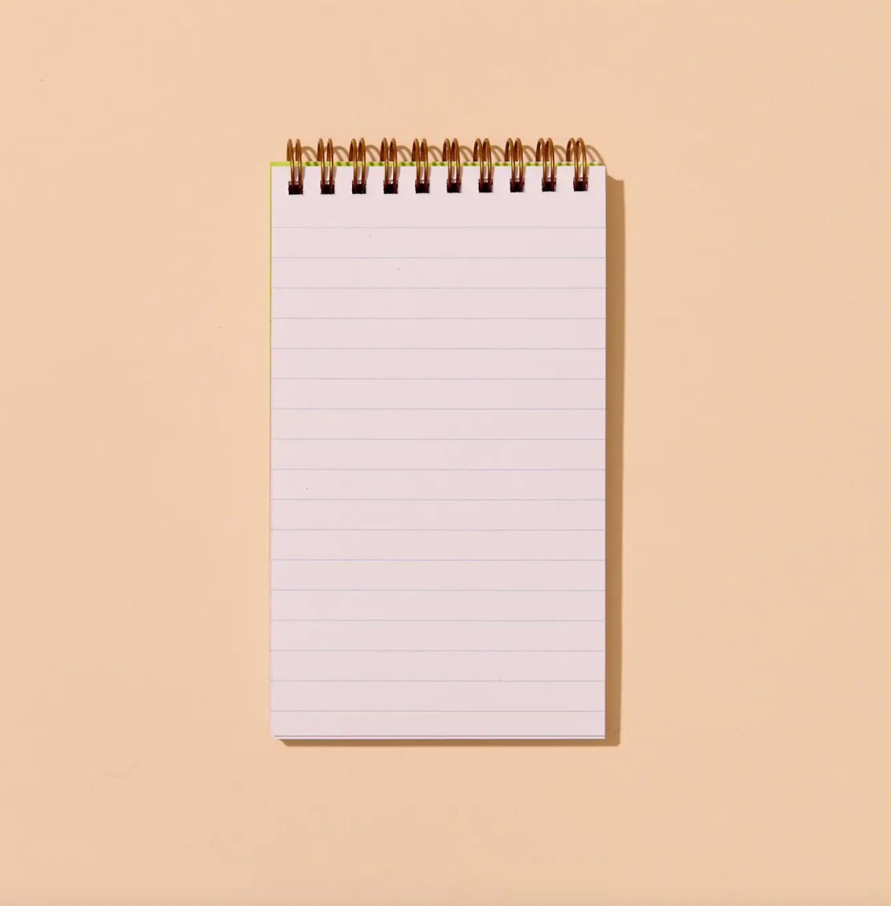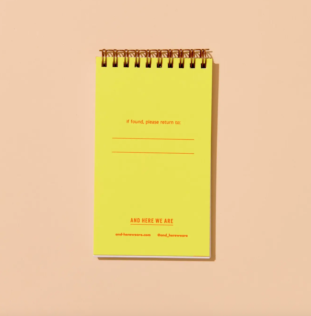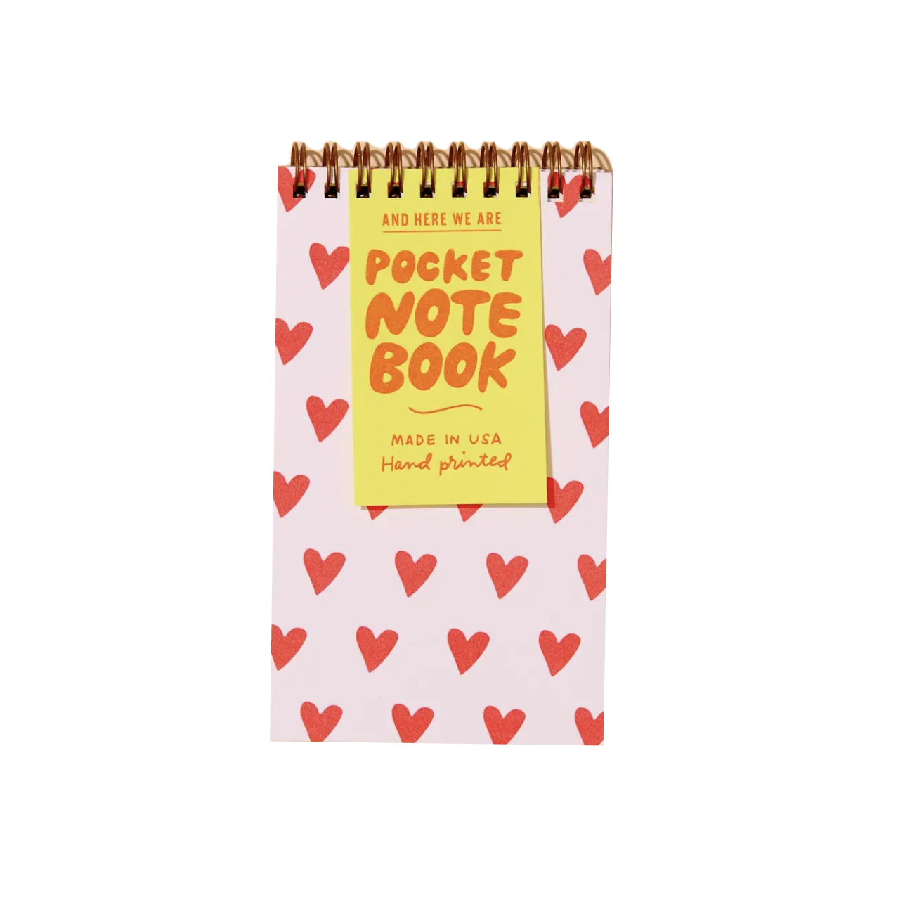 You're sure to fall in love with this pocket-size letterpress spiral notebook, hand printed with a pattern of neon red hearts. 60 lined pages.