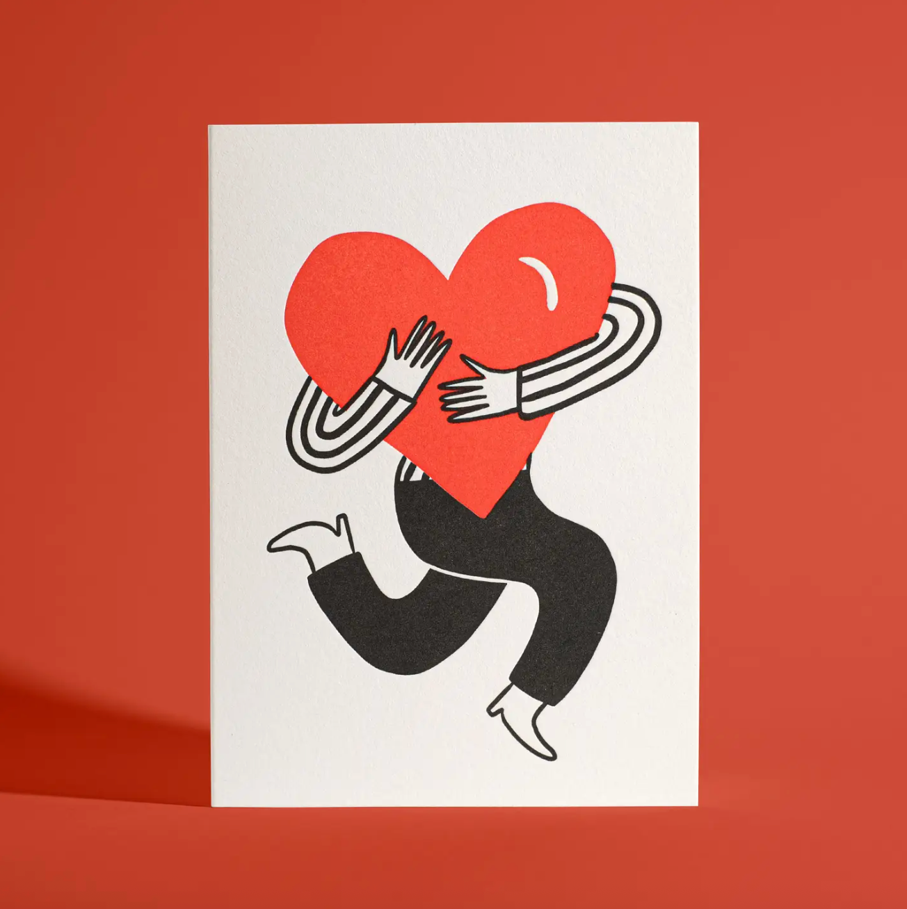 For when you feel a big, big love! Illustration of a person holding a giant heart in red and black ink on cream paper. Illustrated by Allison Cornu-Bitzer.