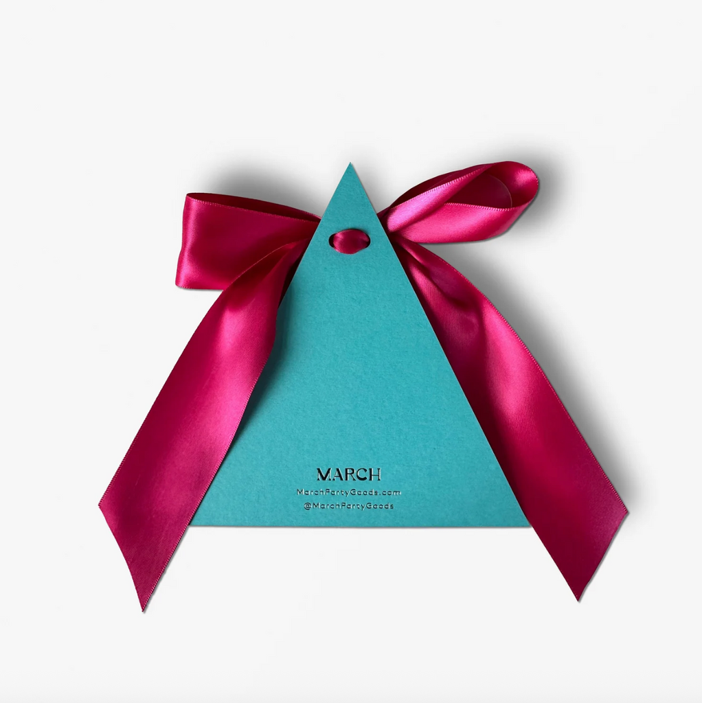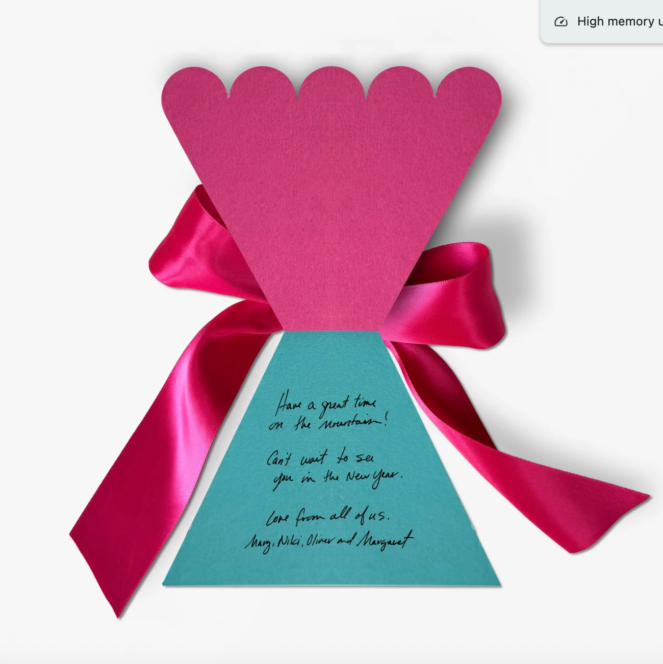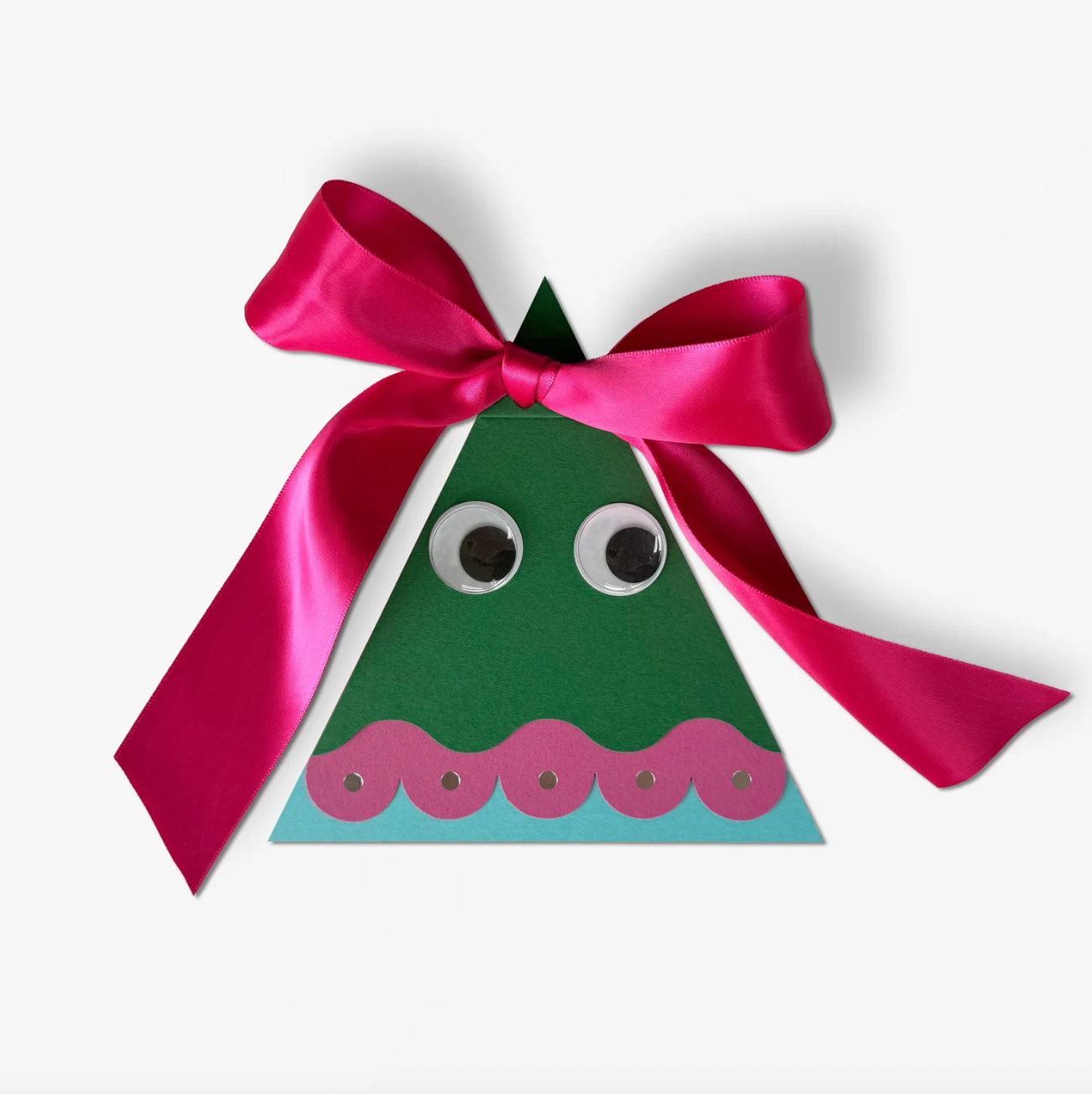 This unique triangular greeting card has three layers joined together with a pink ribbon bow at the top. The googly eyed front of the card folds up to reveal a god foil stamped message, "Looking forward--Happy Holidays and cheers to the New Year!" This layer folds up to reveal a blank page where you can write your own personalized message.
