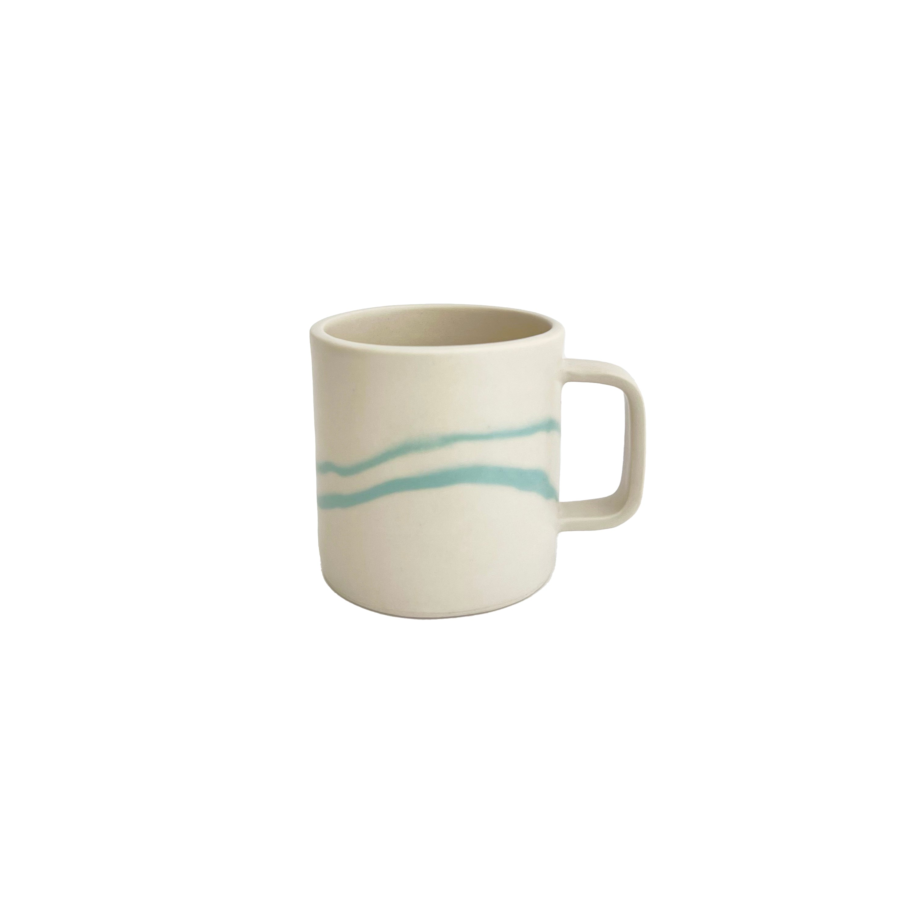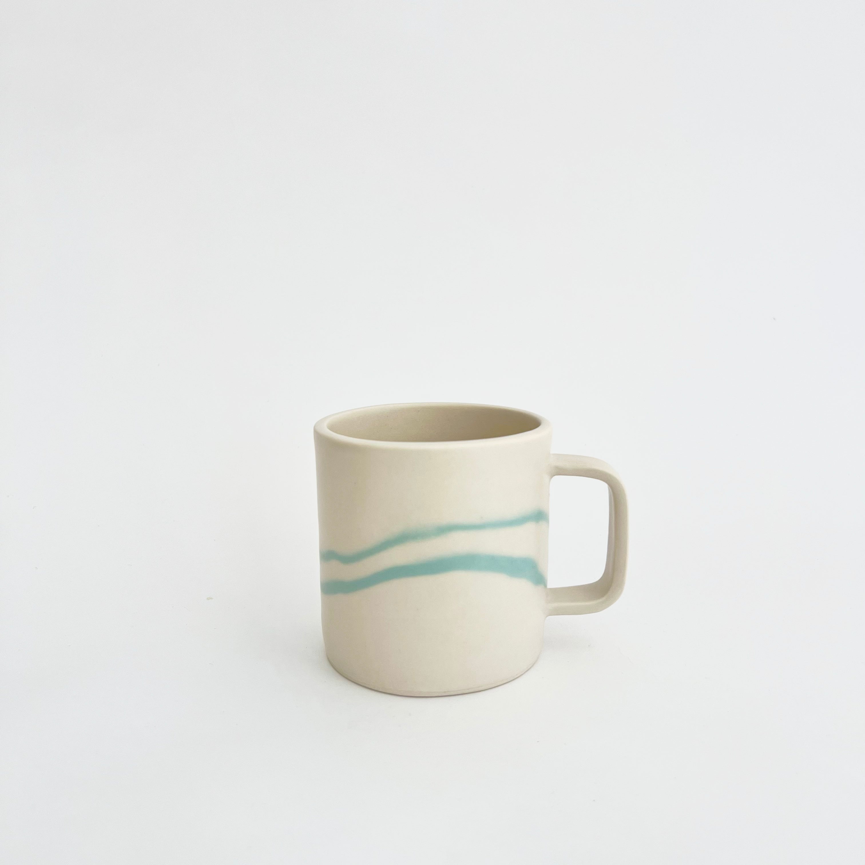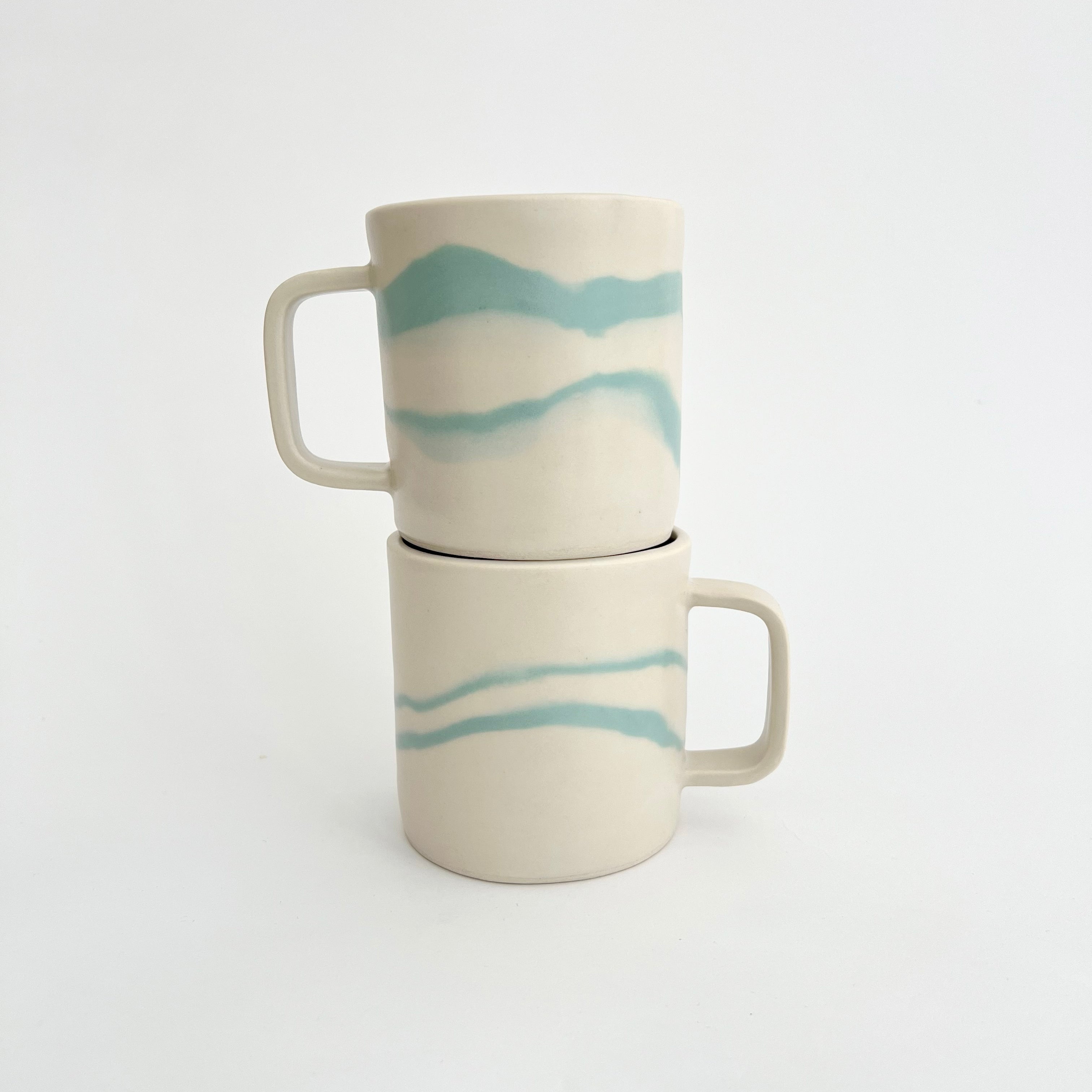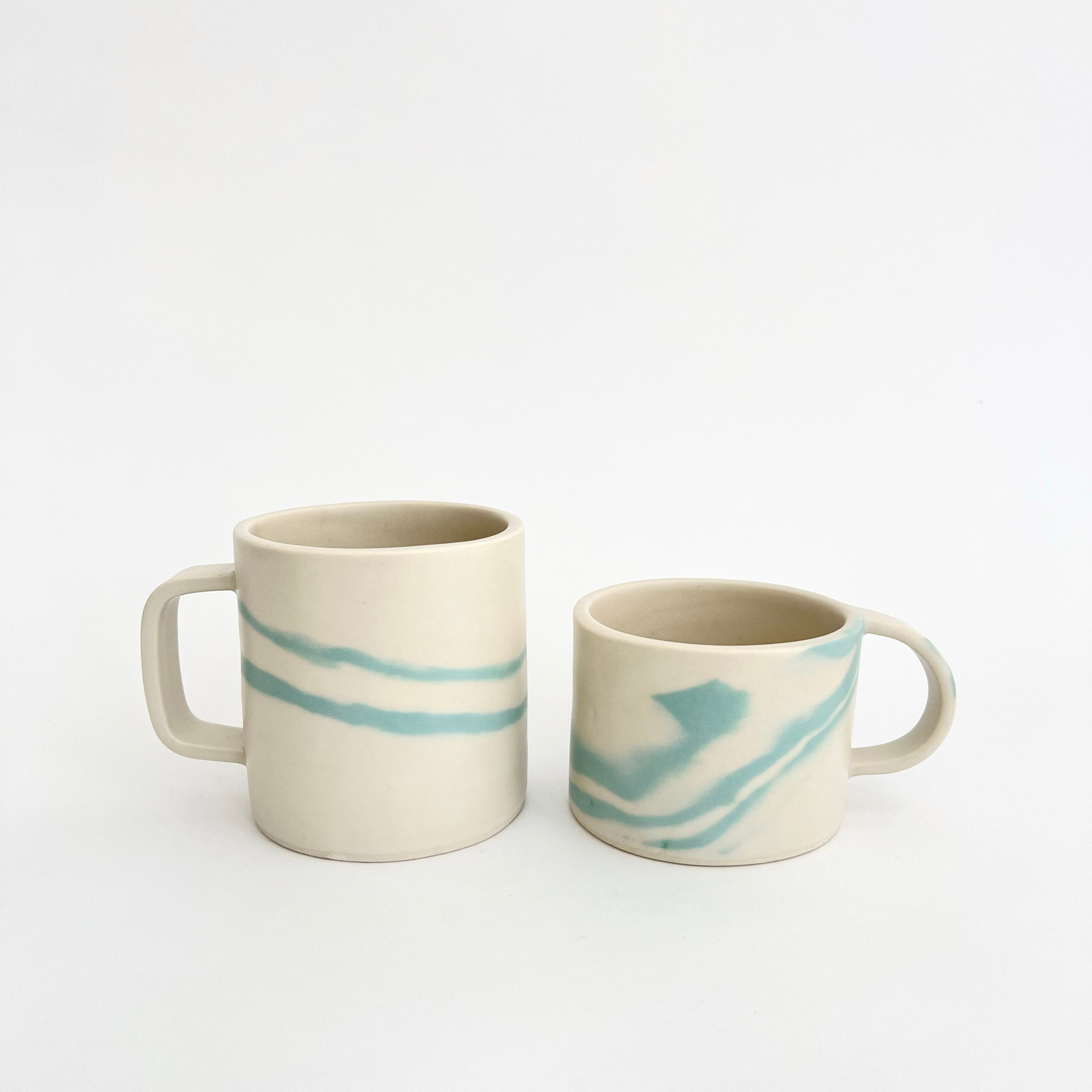 A perfectly proportioned 12 oz mug with a comfortable 3-finger handle. This porcelain mug gets its unique striped pattern from hand-mixed pigment folded into the porcelain using a technique called nerikomi. This process makes each mug unique. Finished with a smooth satin glaze. Last photo shows size comparison with the smaller 8 oz mug.