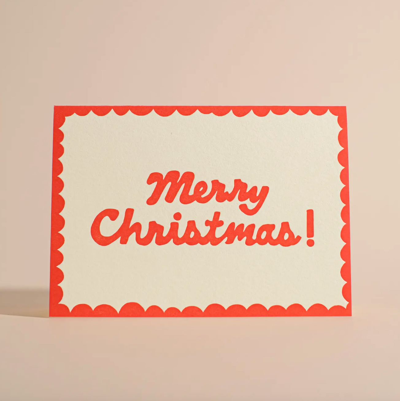 This fun yet minimalist Christmas card features the hand-lettered words "Merry Christmas!" and a scalloped border printed in red on cream paper. Illustrated by Allison Cornu-Bitzer.