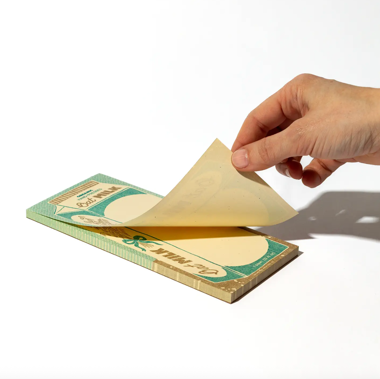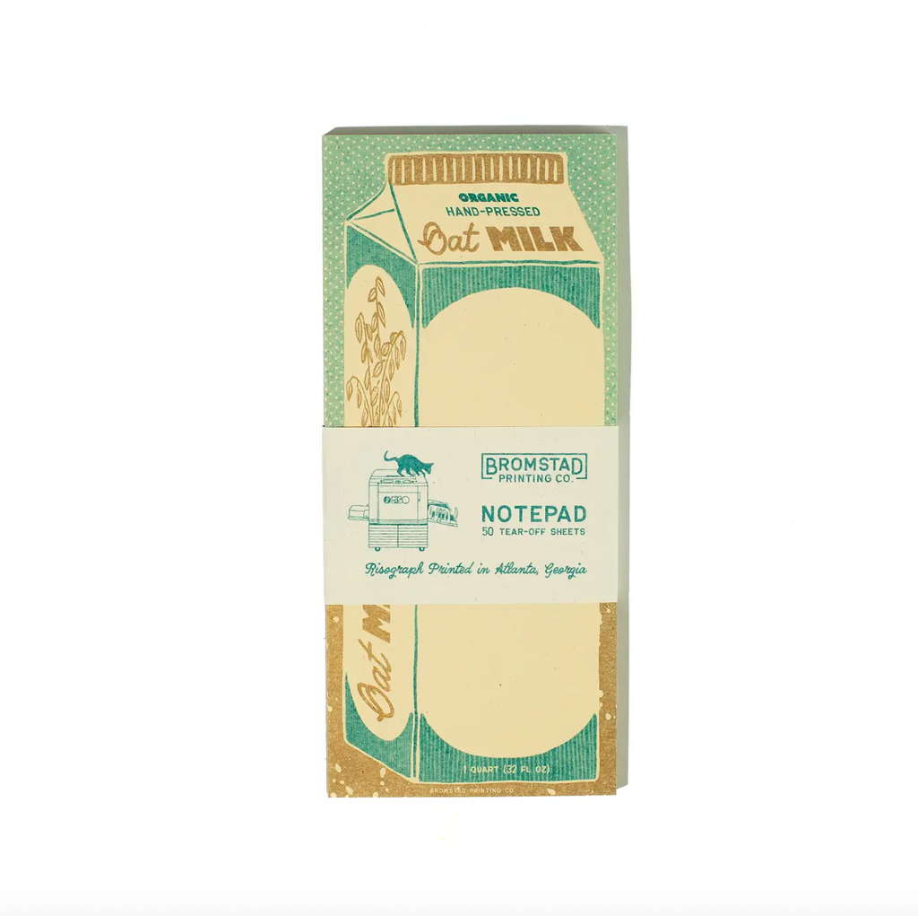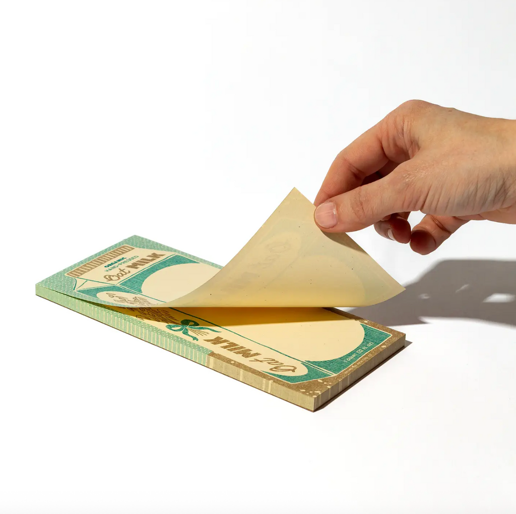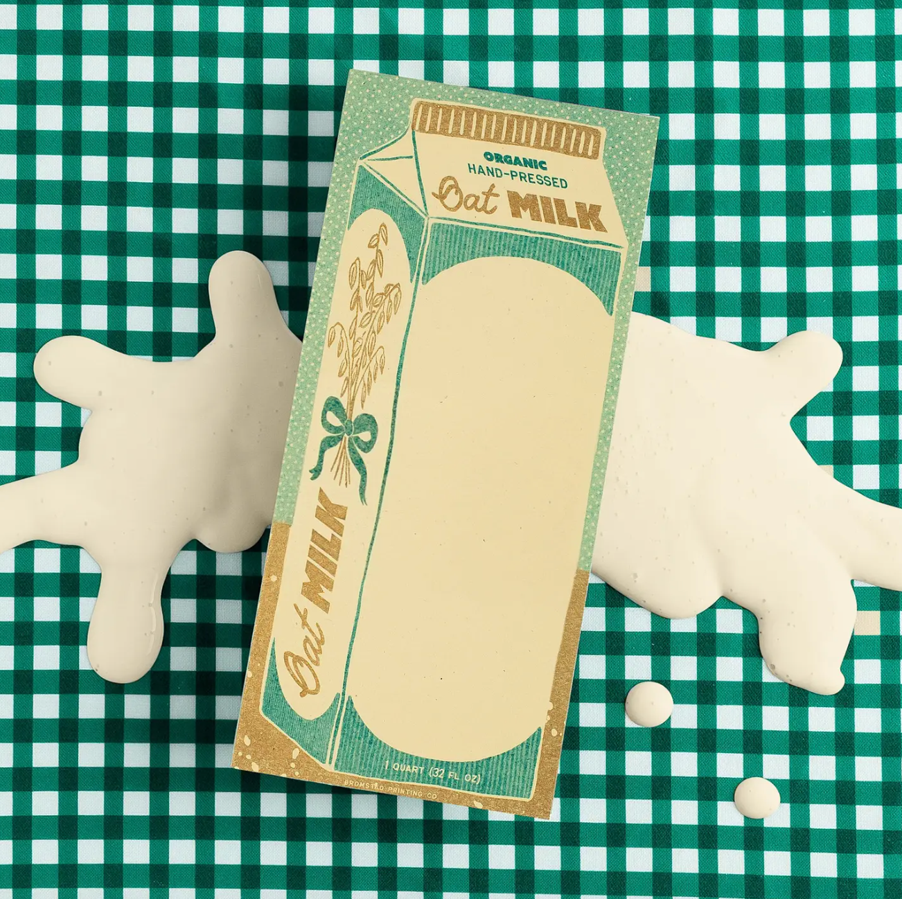 Part of the Quart Collection of charming carton-shaped notepads. Oat milk is for the lactose-intolerant and those looking for plant-based alternatives to dairy. Risograph printed in metallic gold and teal on cream paper.