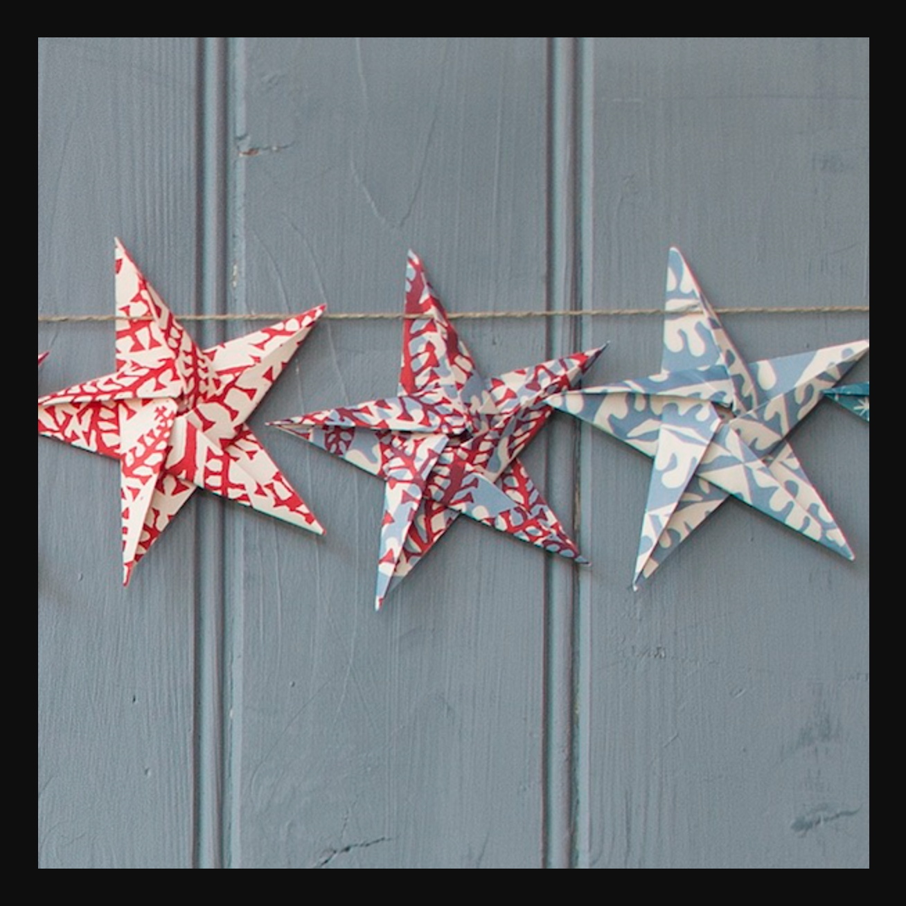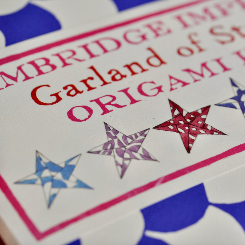 This kit contains everything you need to make 36 double-sided, five-pointed origami stars: 36 different sheets of Cambridge Imprint patterned papers, with a beautifully produced book of instructions, all in a wallet of patterned card.