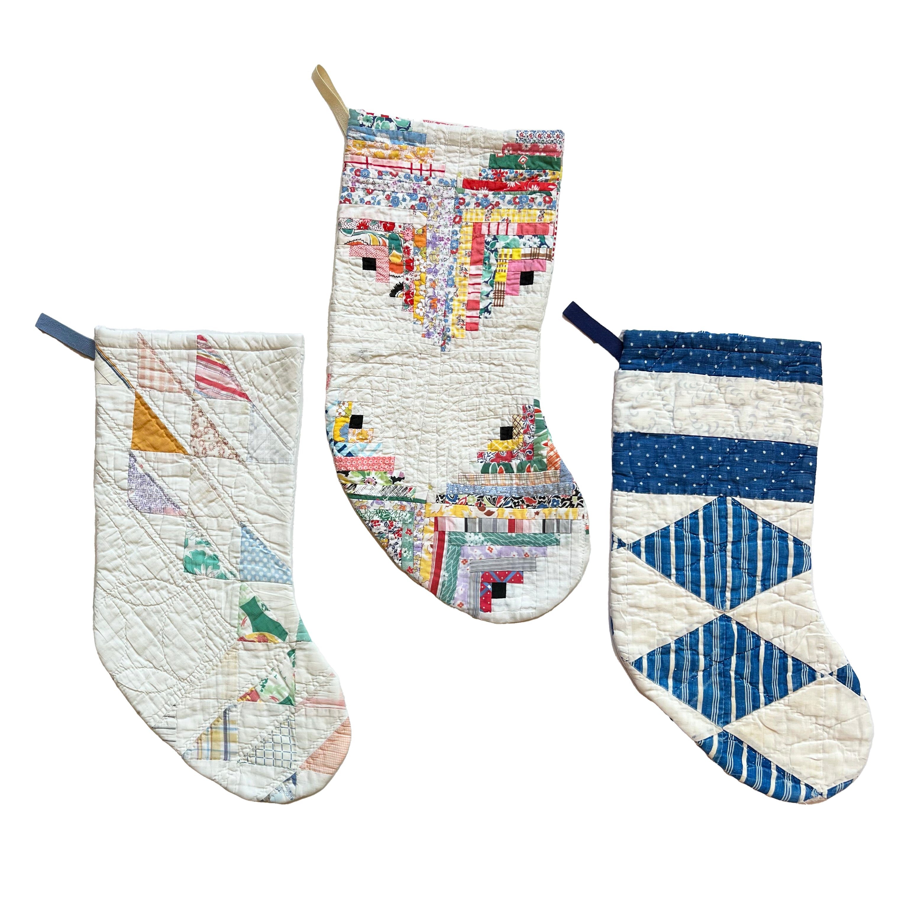 Christmas stockings made from upcycled quilts. These antique and vintage quilts were too damaged to be used as blankets, so Molly of Old Aurora repurposed them into these lovely double-sided quilt stockings. Big enough to hold lots of treats!