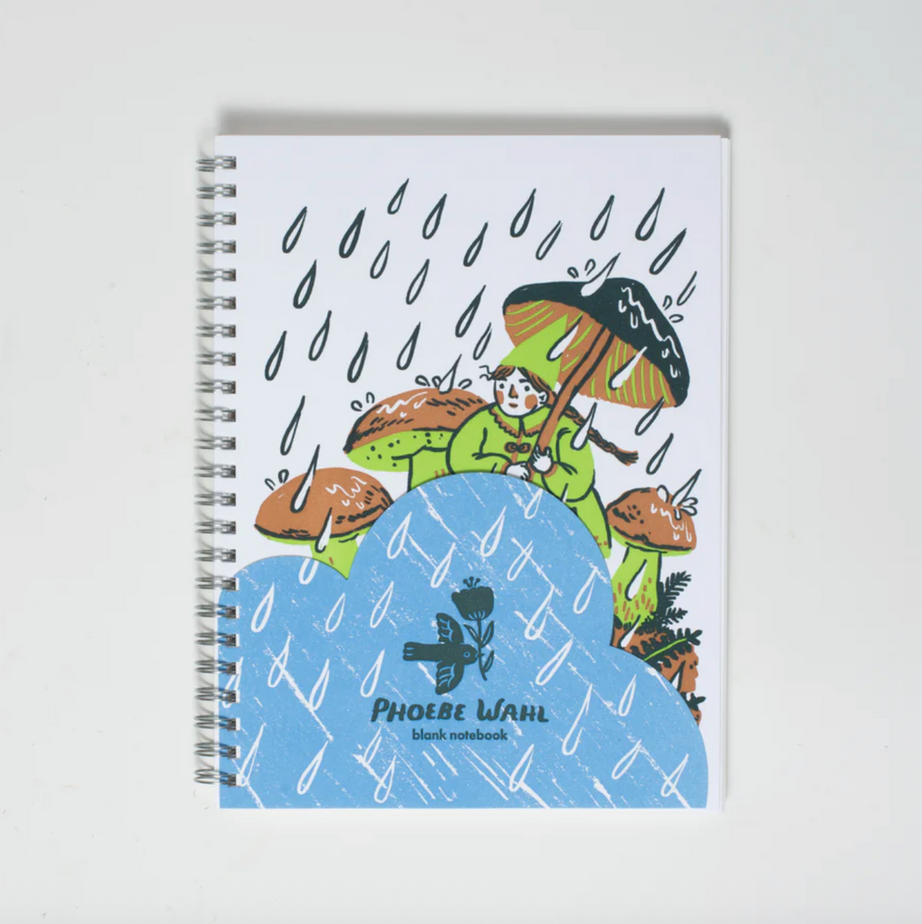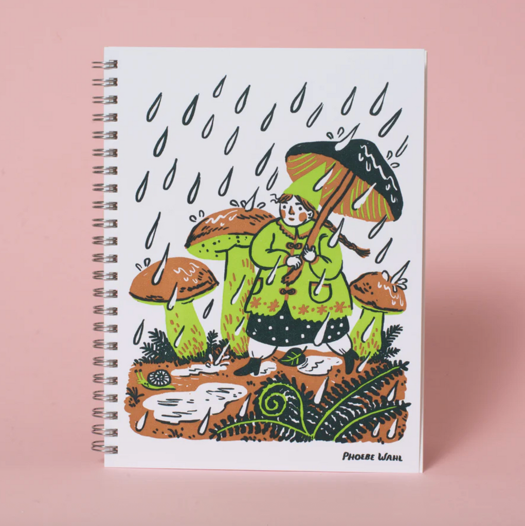 Perfect to write down your thoughts on those rainy fall and winter days, featuring artwork by Phoebe Wahl of a woman with a mushroom umbrella walking in the rain amongst giant bolete mushrooms.