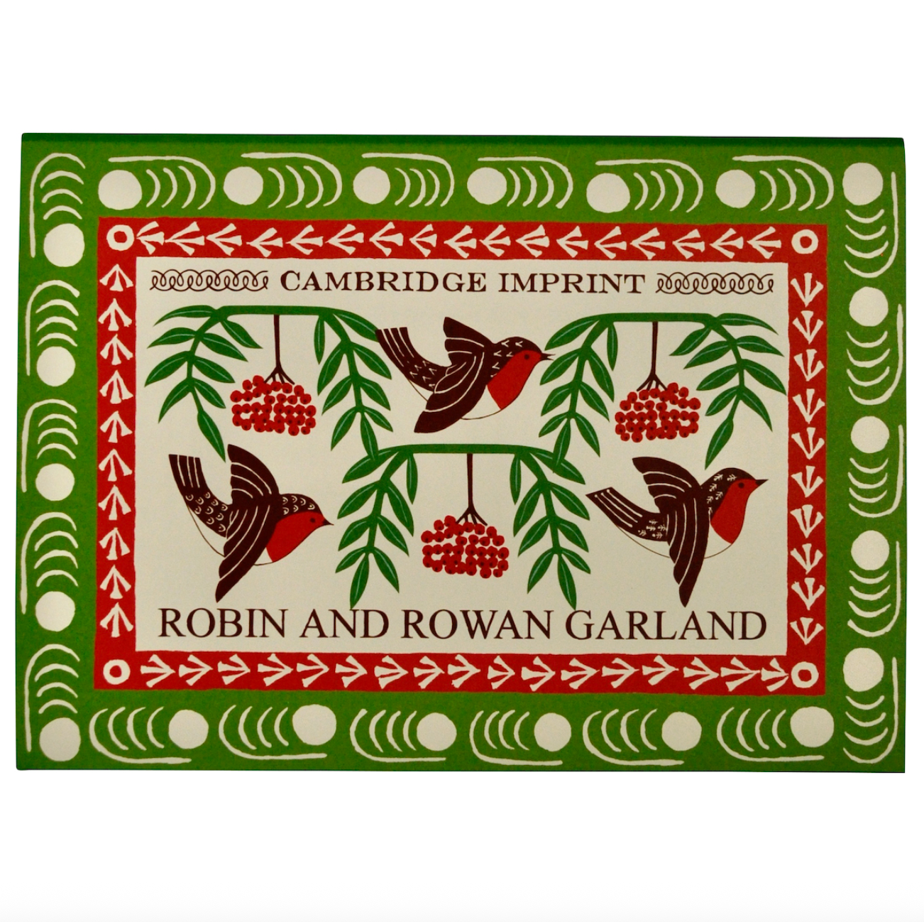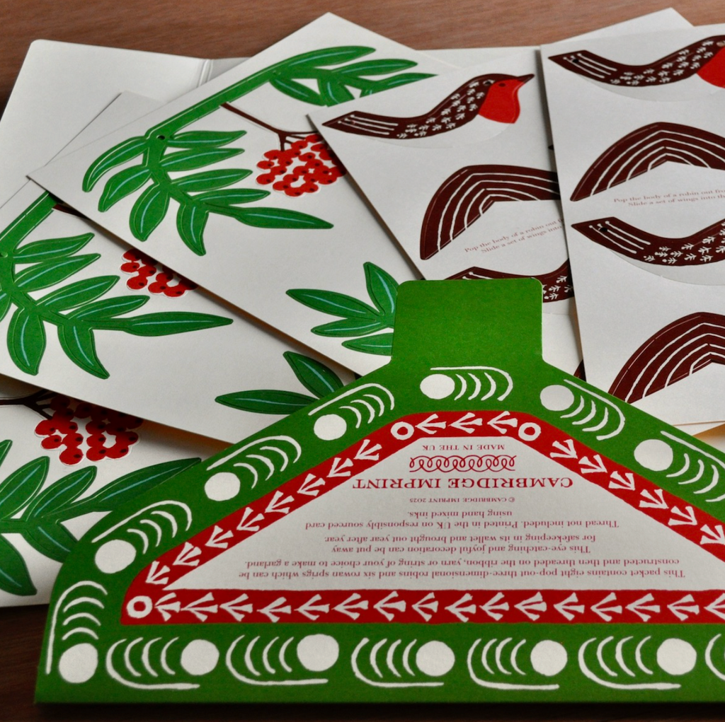 Six sprigs of rowan leaves and bright red berries and eight very charming three-dimensional robins contained in a self-closing card wallet for long term storage. The perfect winter decoration, whether you celebrate the winter holidays or just want to honor the changing of the seasons.