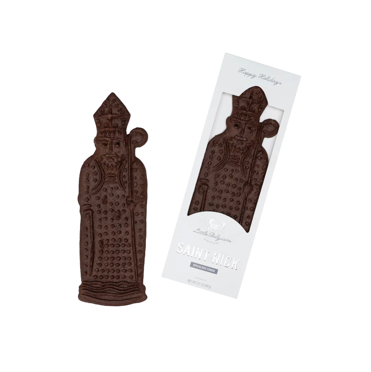 Saint Nick, Santa's European ancestor, is Belgium's most beloved holiday icon. On the eve of December 5th the patron saint of generosity rides his horse over the rooftops and fills children's shoes with toys and extra large speculoos cookies. This new Dark Cocoa Speculoos Spice Saint Nick cookie is approximately 10" tall and makes a delicious holiday gift to fill shoes and stockings alike!