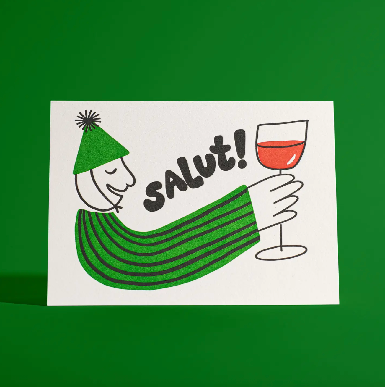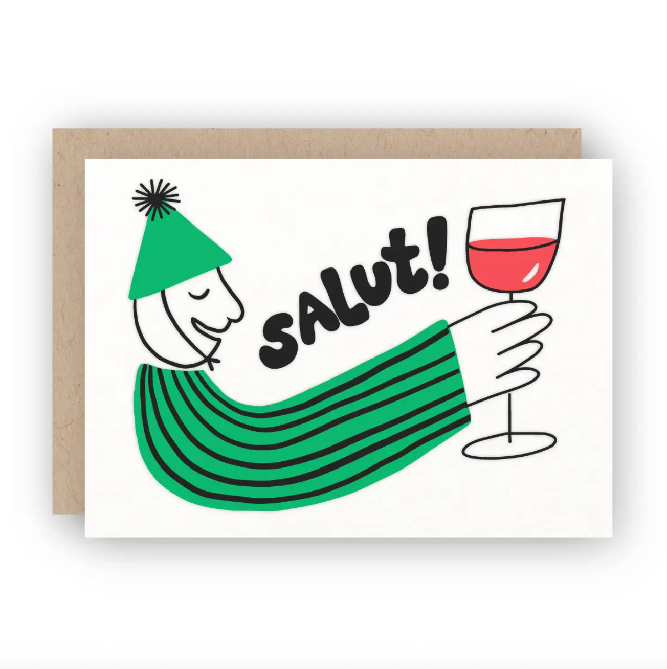 Cheers to all things to celebrate with this salut letterpress printed greeting card. Features a fun lil guy in a party hat with a glass of wine and the word "Salut!" Perfect for the festive winter season, and celebrations year-round. Illustrated by Allison Cornu-Bitzer.