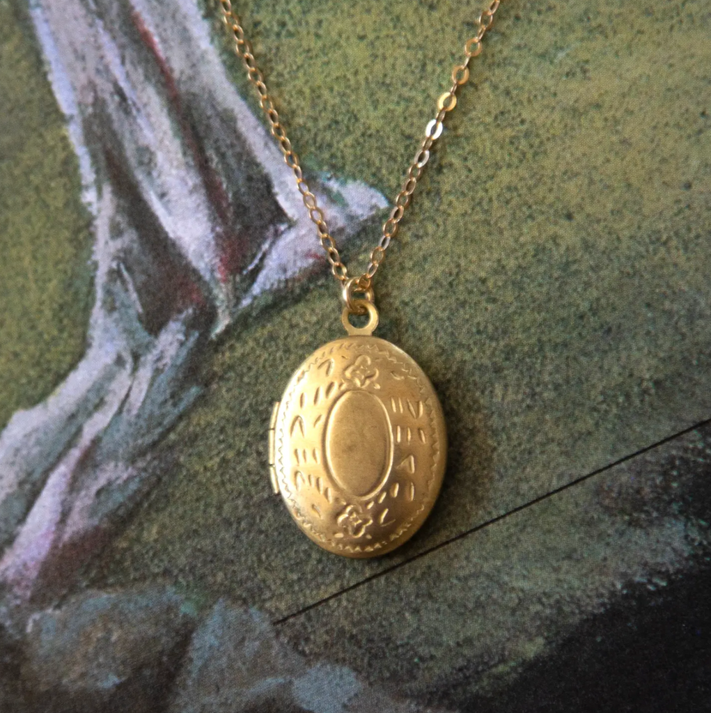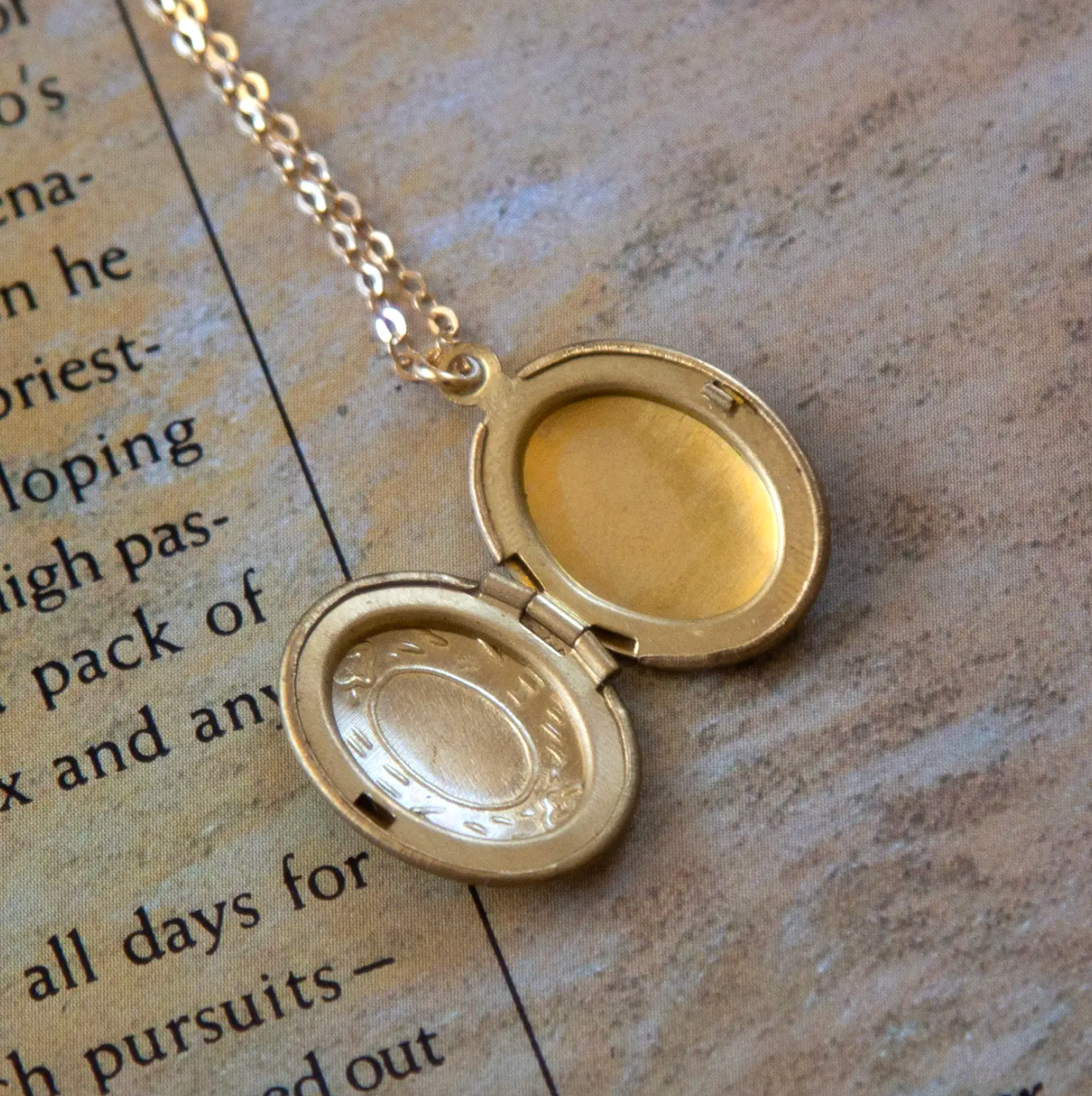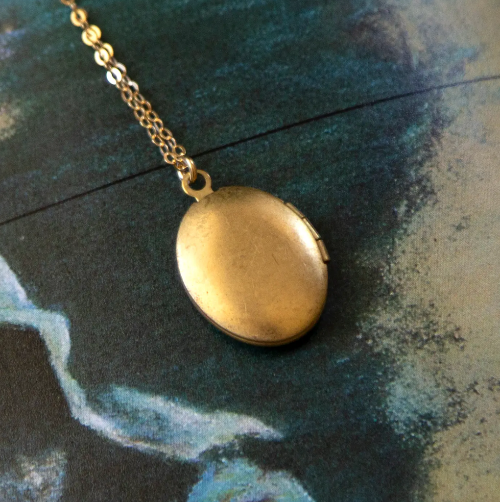 Deadstock vintage brass oval locket charm with dainty stamping hung on an 16" delicate high-quality gold vermeil cable chain (2X industry standard gold-plating on 100% recycled sterling silver). Put a picture of your grandma, your dog, or your sweetheart in there!