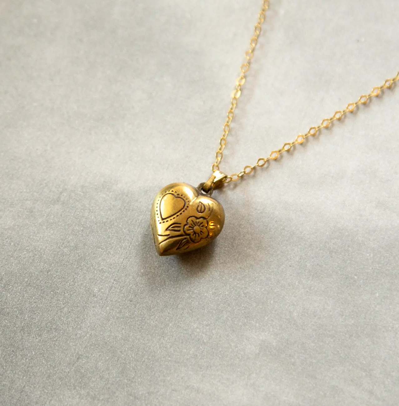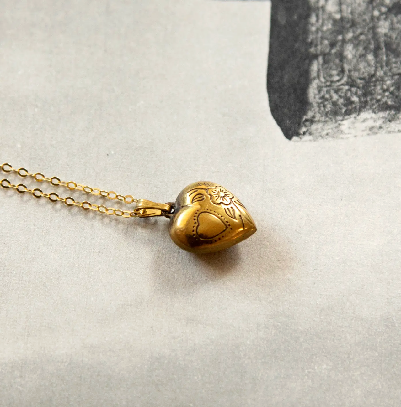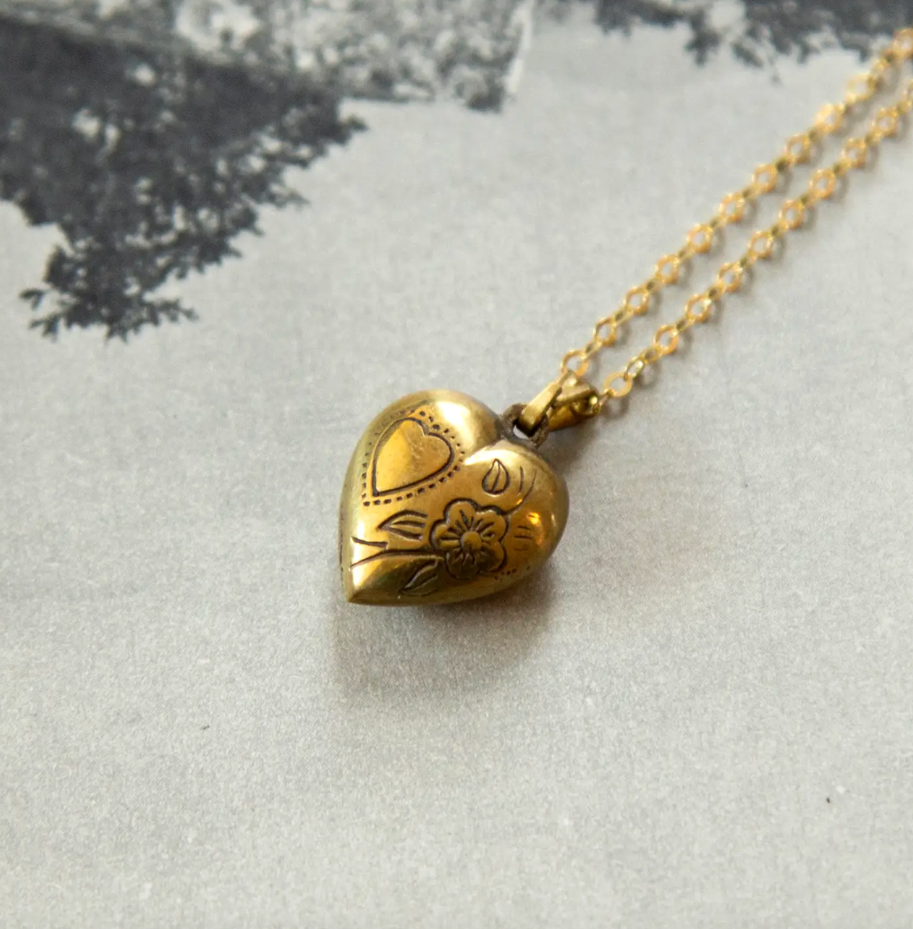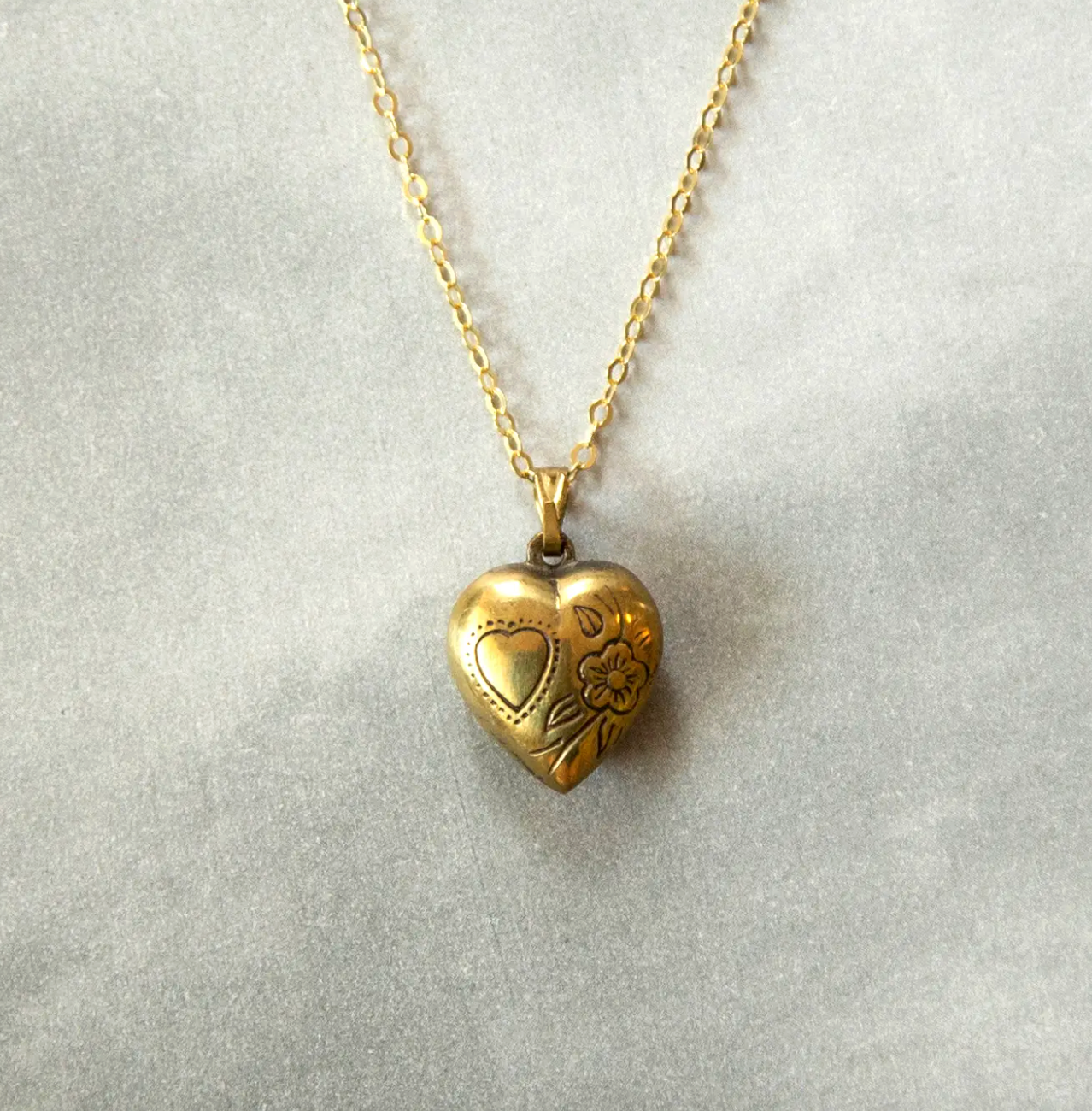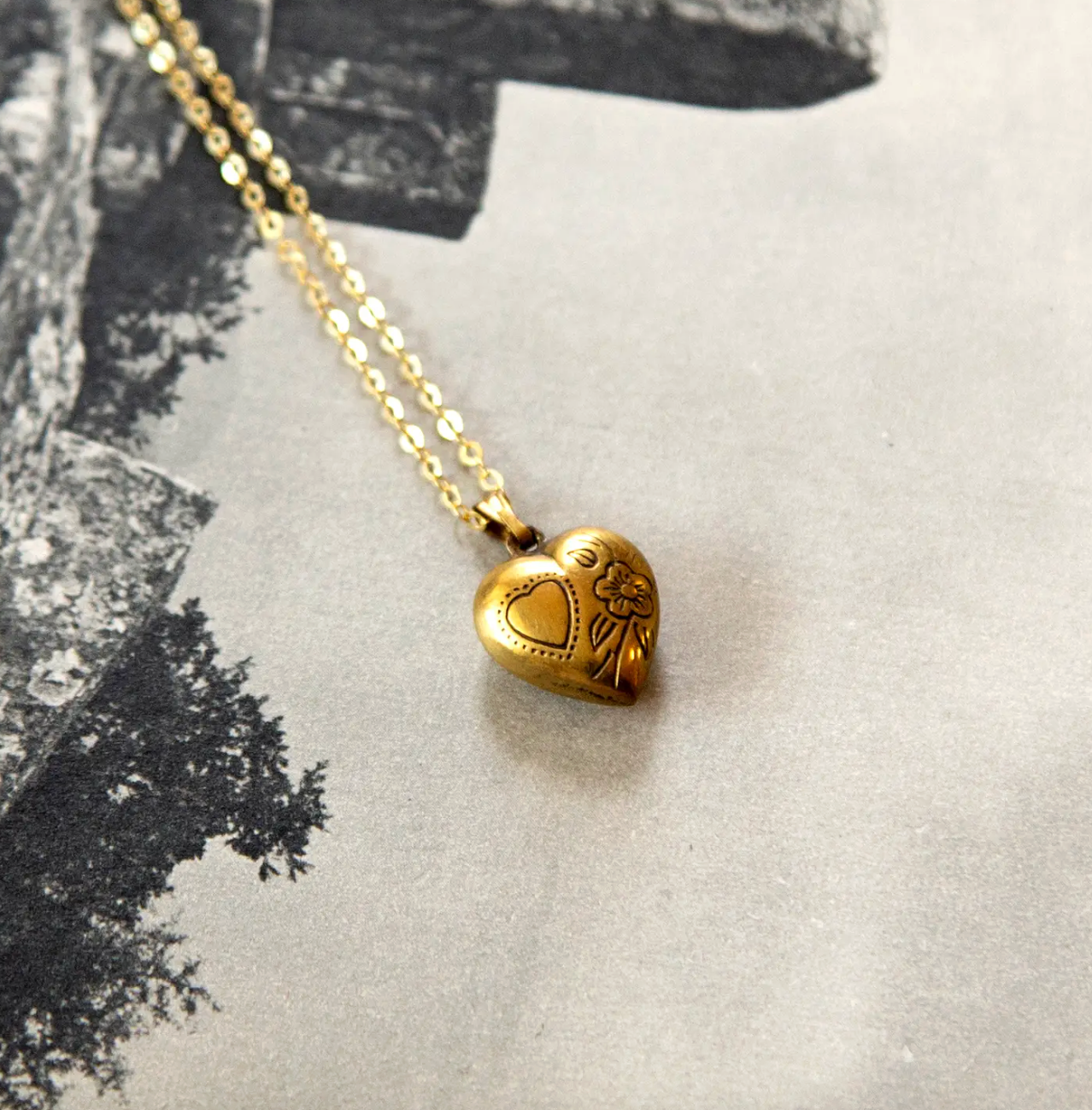 This dainty and lightweight deadstock vintage 3D hollow puff heart charm has a charming etched bird and floral design reminiscent of the Victorian era. Vintage brass charm and bail on a high quality gold vermeil cable chain. A perfect Valentine's Day present.