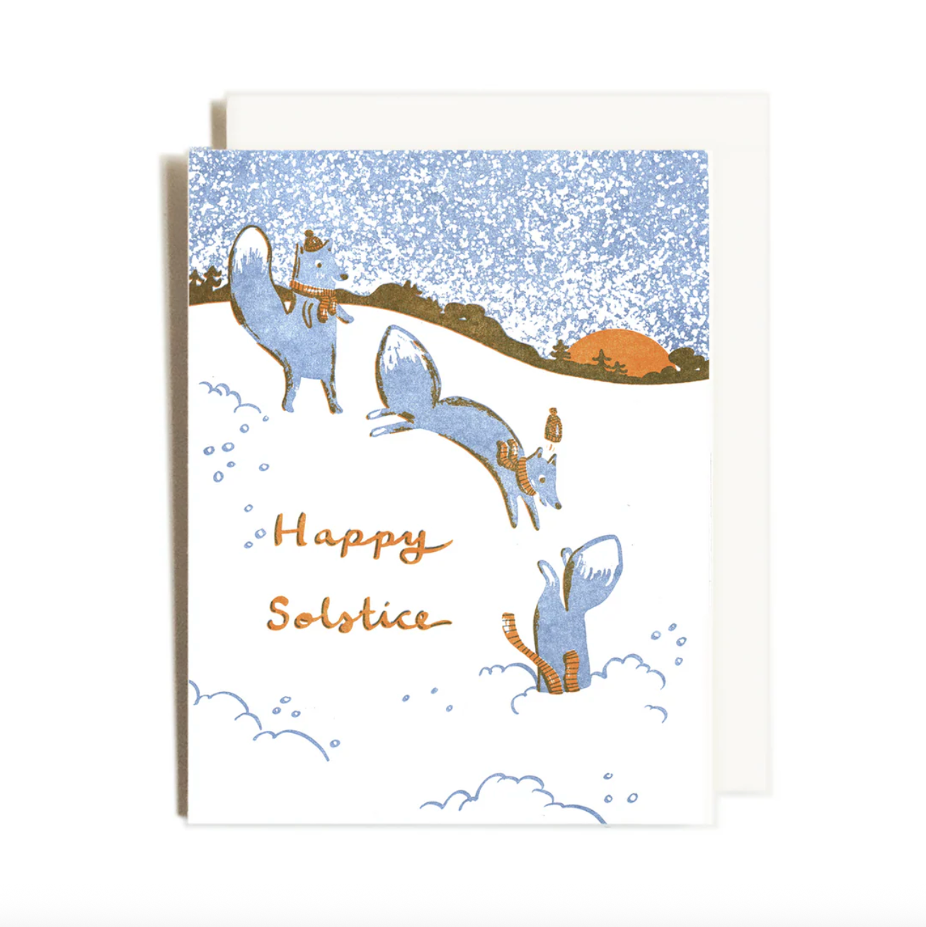 Three foxes in little hats and scarves cavort in the snow as the sun sets. Card says "Happy Solstice" and is blank inside. Designed and printed by Homework Letterpress Studio.