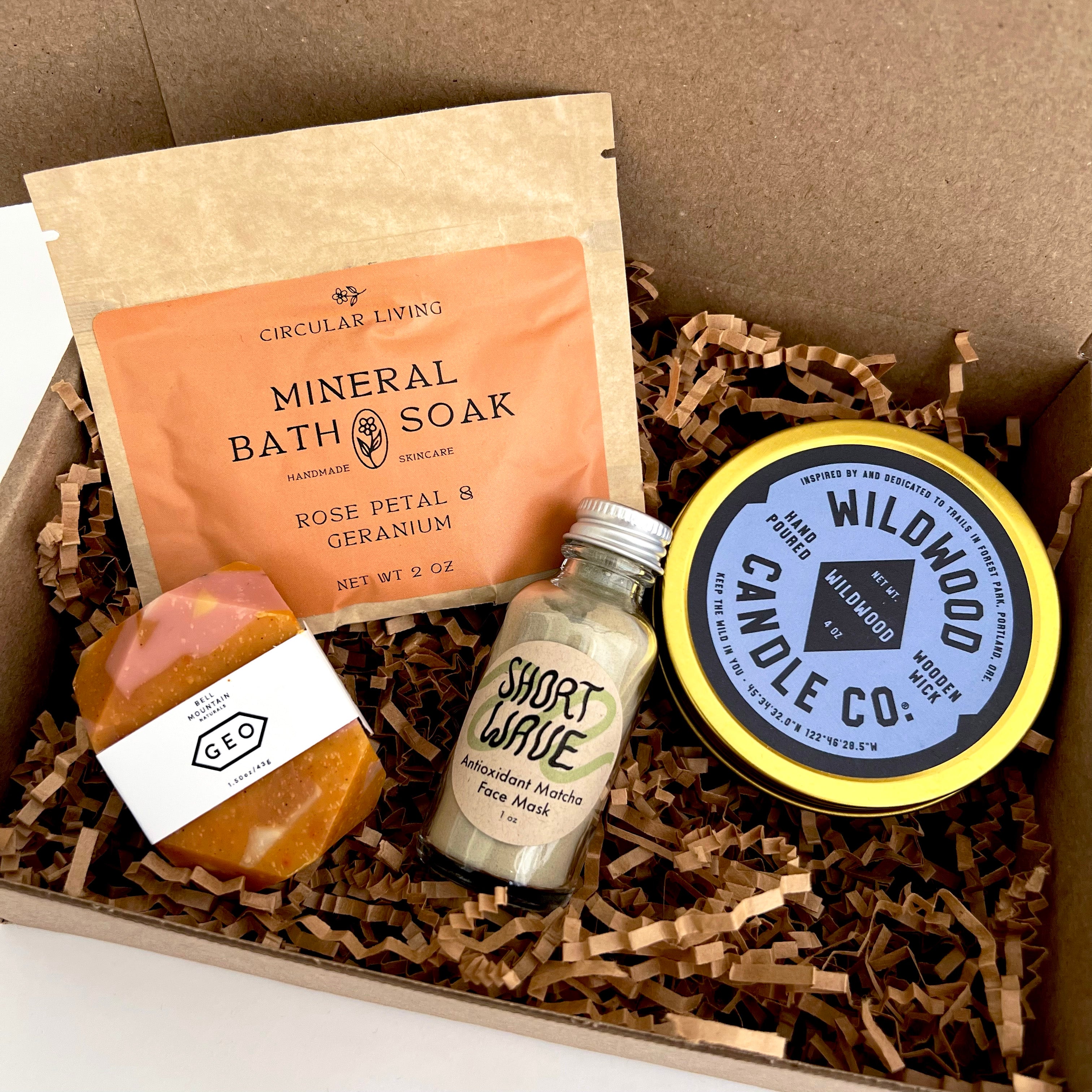 Give the gift of relaxation! This deluxe gift box contains everything a person needs for a spa day at home. Featuring a bath soak, face mask, soap, lip balm, a natural bath pouf, a candle to set the mood and some Oregon made herbal tea to help anyone wind down.
