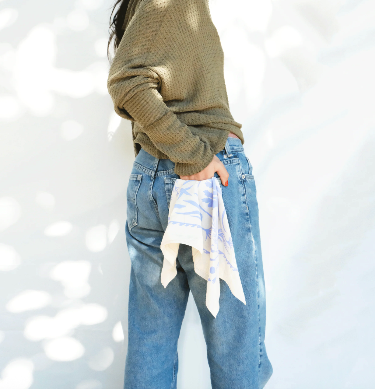This screen-printed bandana is perfect for carrying as an everyday keepsake. Wear it around your neck or in your hair, wrap up snacks and gifts, hang it as a tapestry, and so much more. Bandanas are incredibly versatile and have been worn and used functionally for generations by sailors and seafarers, farmers and cowgirls. Ethically made with 100% cotton and earth-friendly ink, this beautiful and durable textile is a staple of the contemporary wardrobe and makes a wonderful gift.