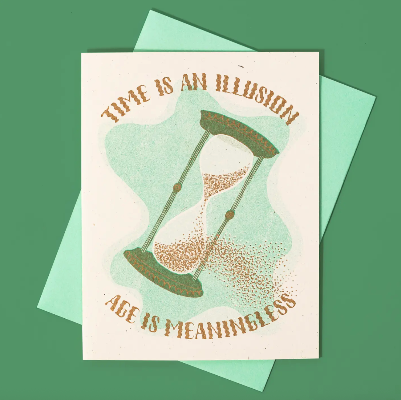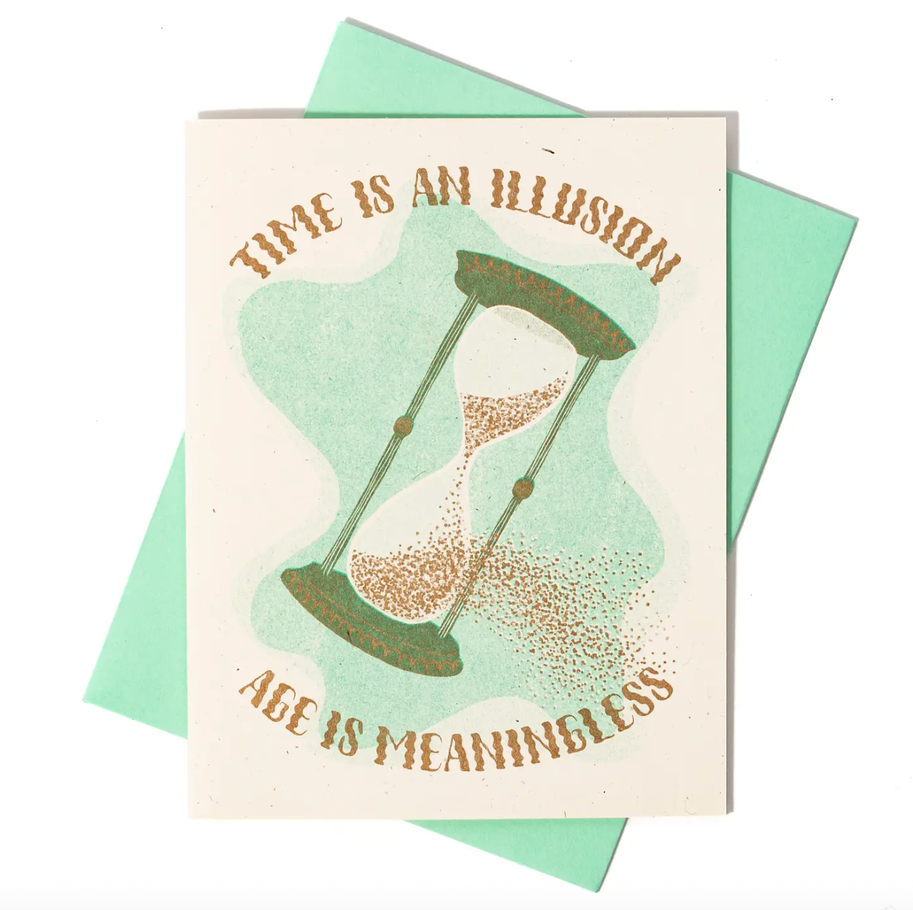 For the person who dislikes the march of time comes this comforting reminder that all of it is sort of made up. Grains of sand pour out of an hourglass to underscore the truth: time is an illusion, age is meaningless. Risograph printed in seafoam and metallic gold.