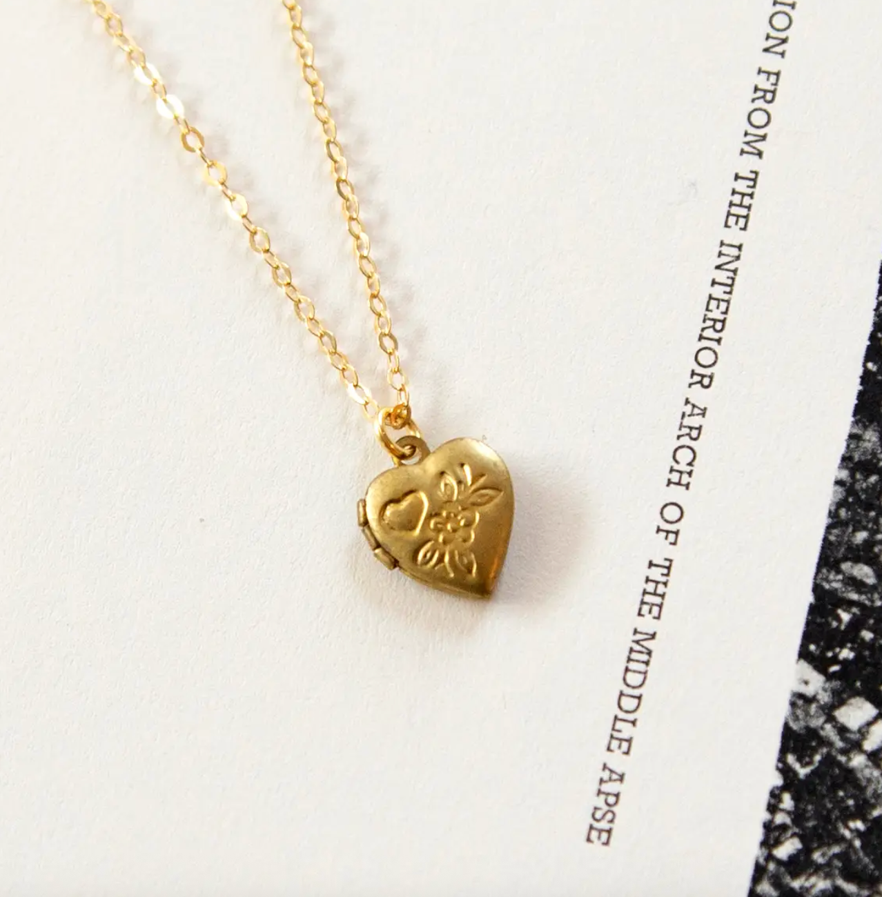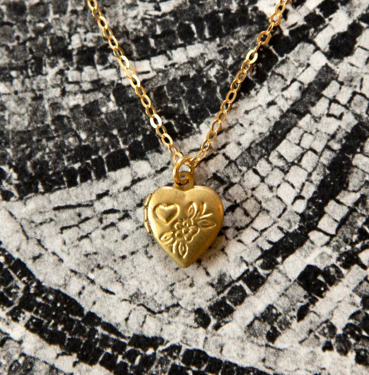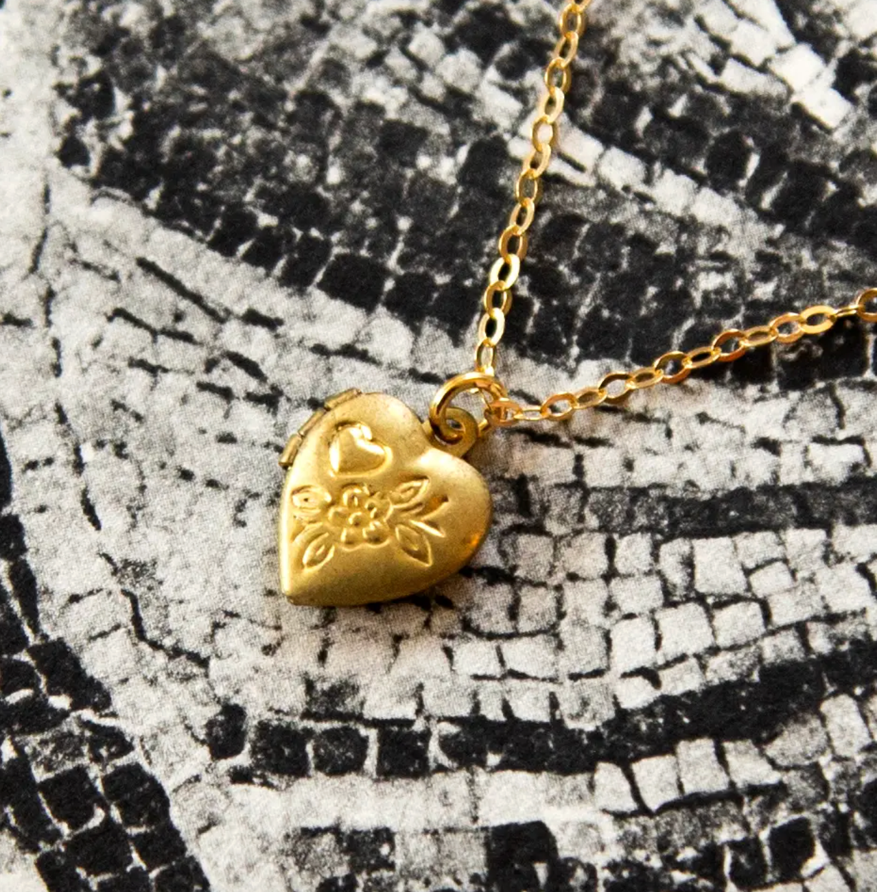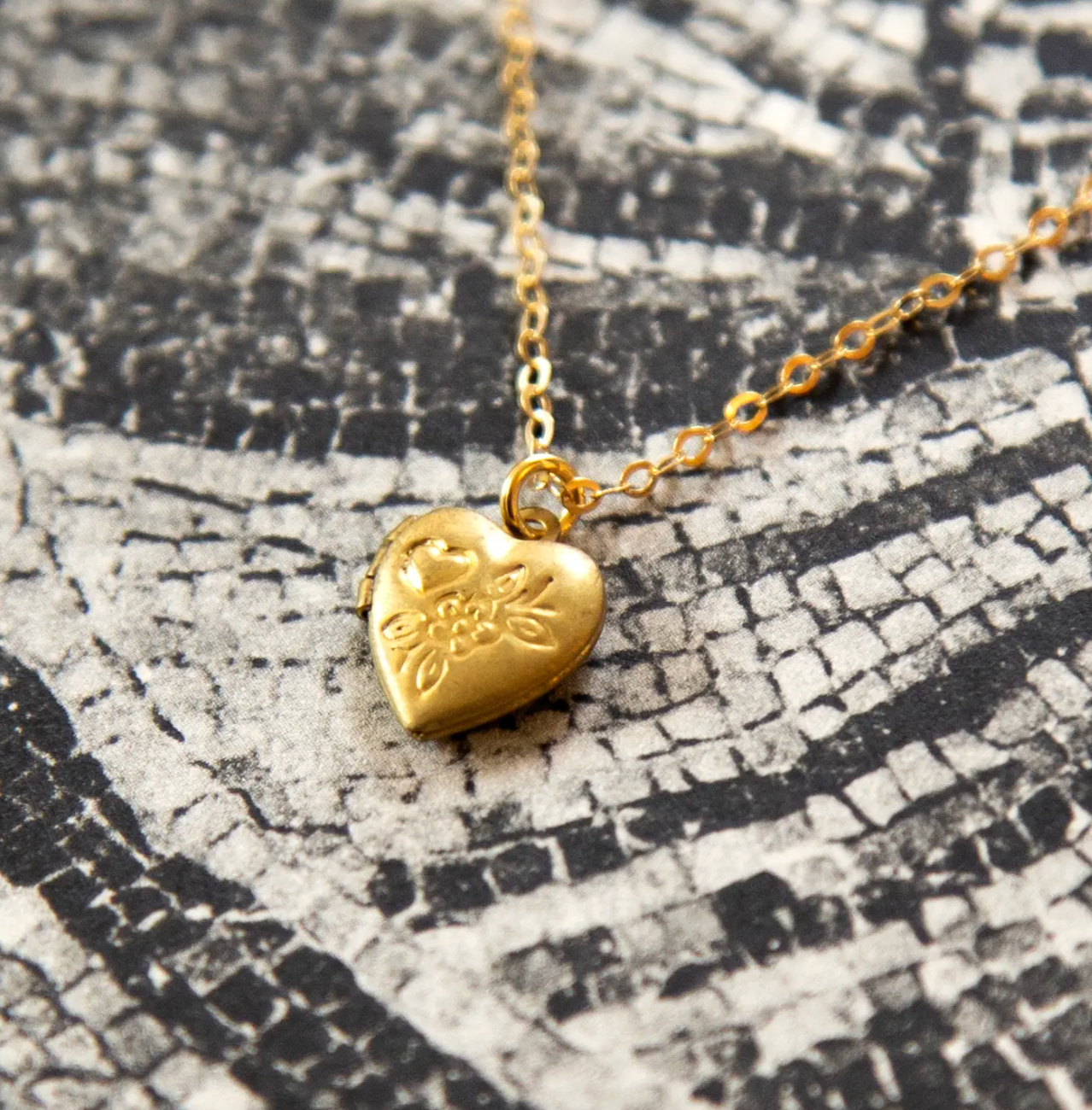 Deadstock vintage tiny little brass heart locket charm with heart & floral stamping, on a high-quality gold vermeil cable chain. Locket opens!