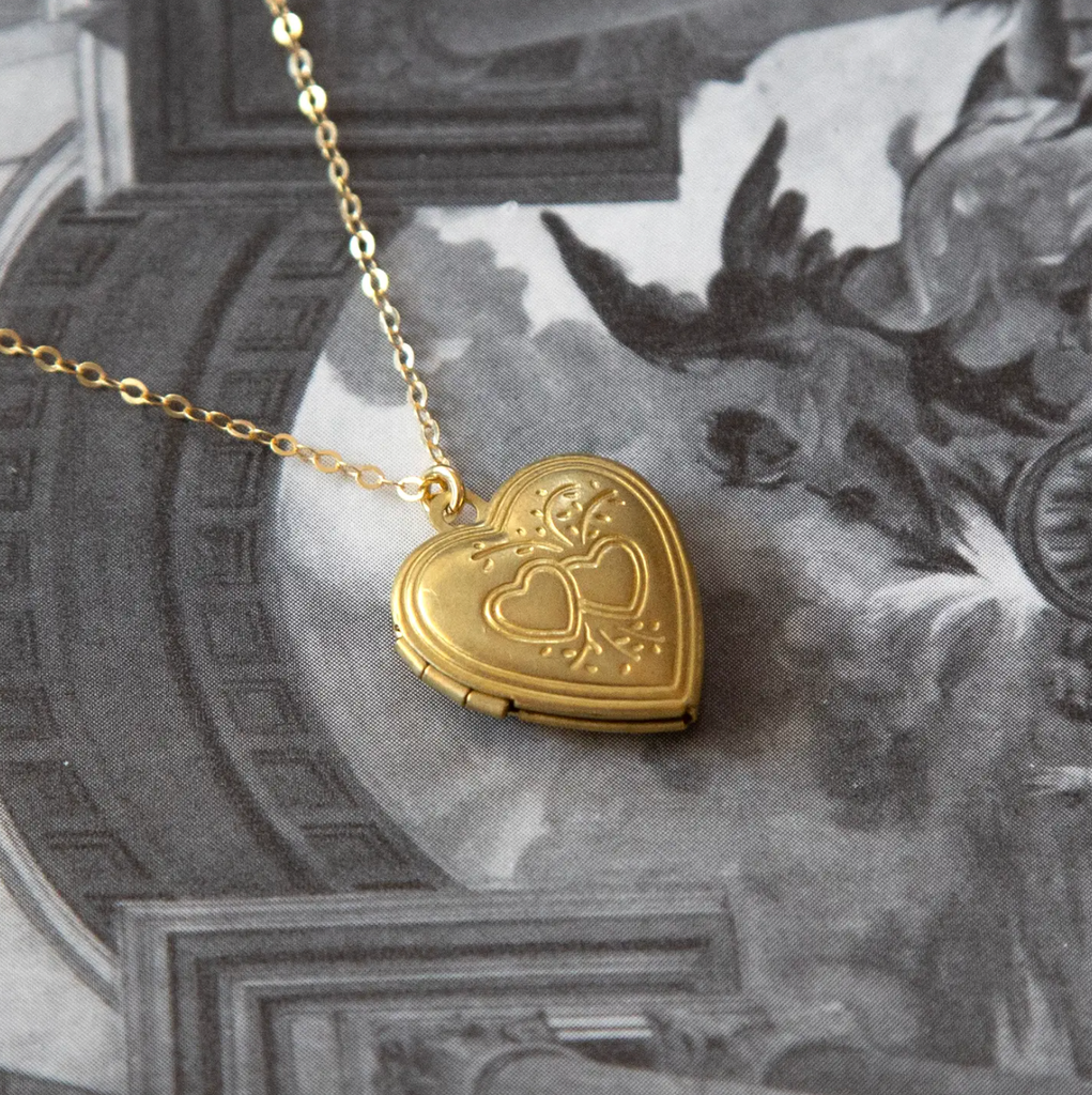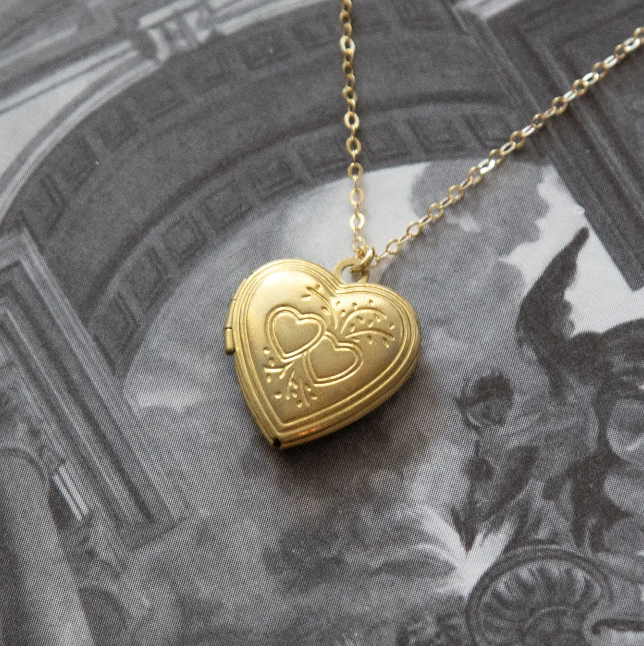 Deadstock vintage brass heart-shaped locket charm with stamped design of two hearts hung on an 16" delicate high-quality gold vermeil cable chain (2X industry standard gold-plating on 100% recycled sterling silver). Put a picture of your grandma, your dog, or your sweetheart in there!
