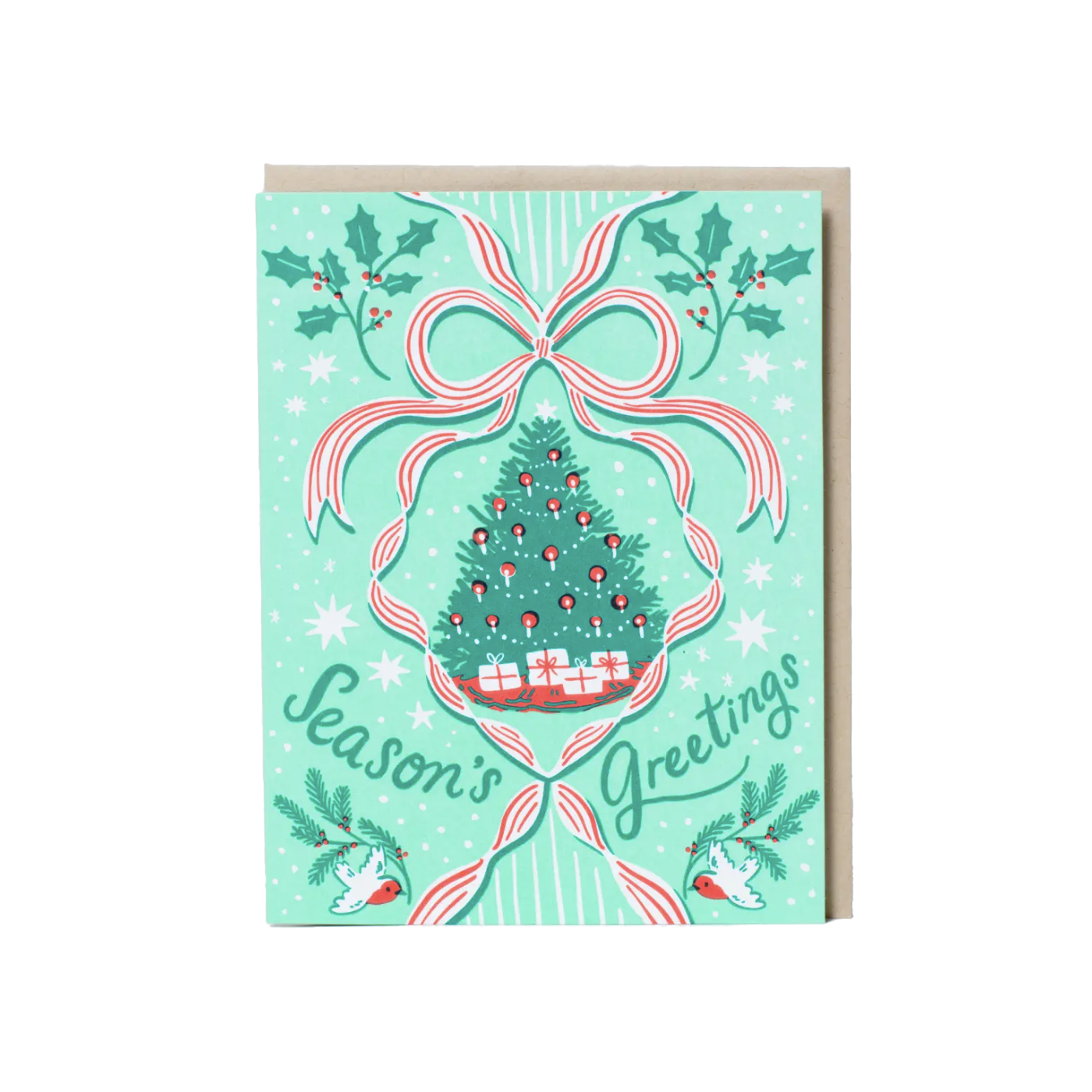 A retro-inspired design featuring a Christmas tree with presents tucked underneath, framed by striped ribbons, greenery and little birds with the words "Season's Greetings."